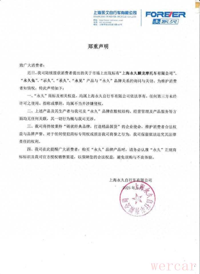 上海永久自行车有限公司9月25日发布声明称,市场上“上海永久麟龙摩托车有限公司”“永久兔”等产品与公司及“永久”品牌无任何关联。“永久”商标归公司独有,第三方未经许可使用涉嫌侵权。公司将依法追究侵权行为,维护品牌权益。