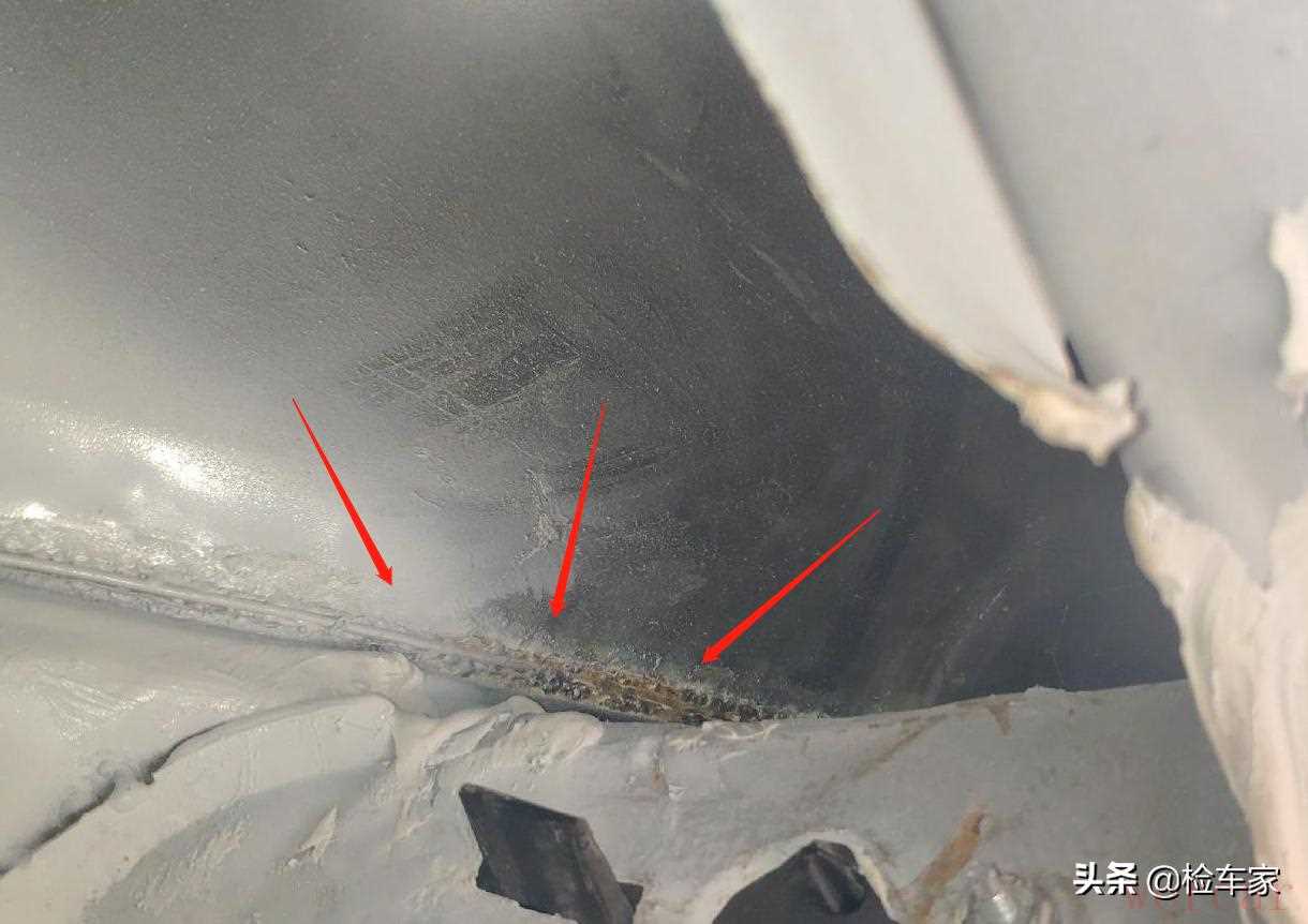 第一刀找到了,右侧C柱位置成线性切割,肯定是这里了;第二刀是在右侧下边梁位置,原车的焊点早已不见且内侧漆面数值呈线性。这下右后叶子板切割焊接是妥妥的了。