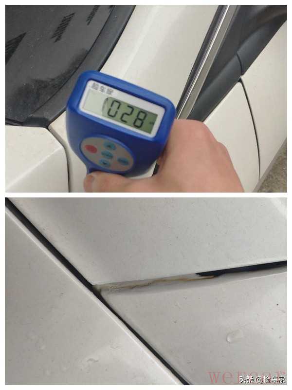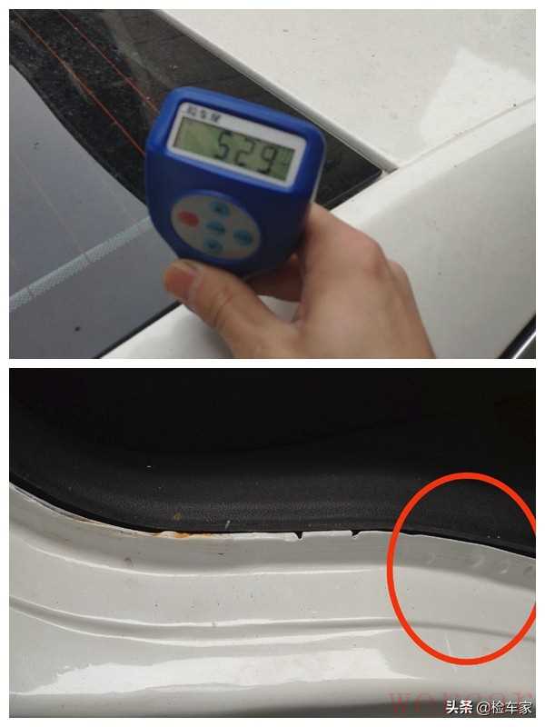 首先测量一下车顶的漆面数值,看能不能作为其它面的参考数值,因为就算发生事故,一般车顶在事故过程中是最不容易伤着的部分,结果我刚一怼上去,就发现上面的车顶已经有钣金喷漆的情况了,看来这辆车有点不容乐观啊!接着看。