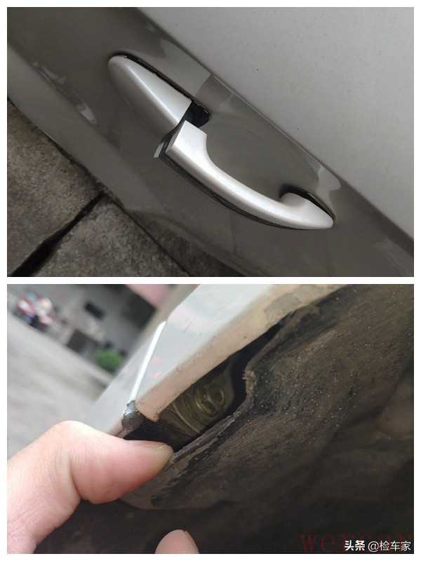 接着我检测到左侧A柱位置时,发现有存在钣金喷漆的情况,而A柱属于车身结构件,那在国标定义里面,这个车子已经是事故车了,可以看到A柱位置还有没有处理好的腻子灰。