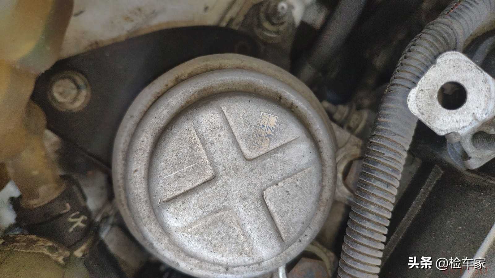 之前就已经清楚了车头有碰撞,但要具体看一下,碰撞的严重程度,可以看到水箱框架有拆卸拧动的痕迹。