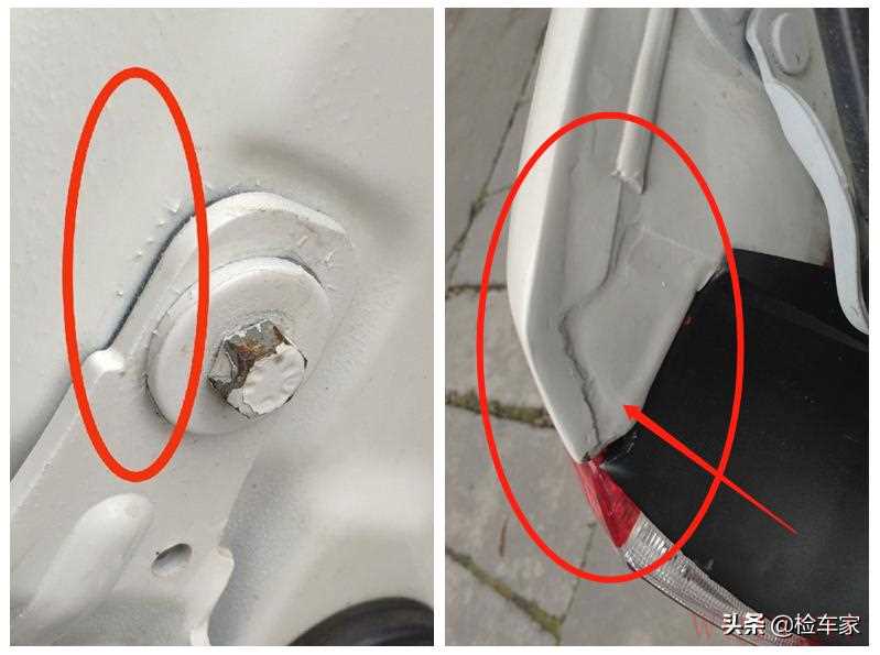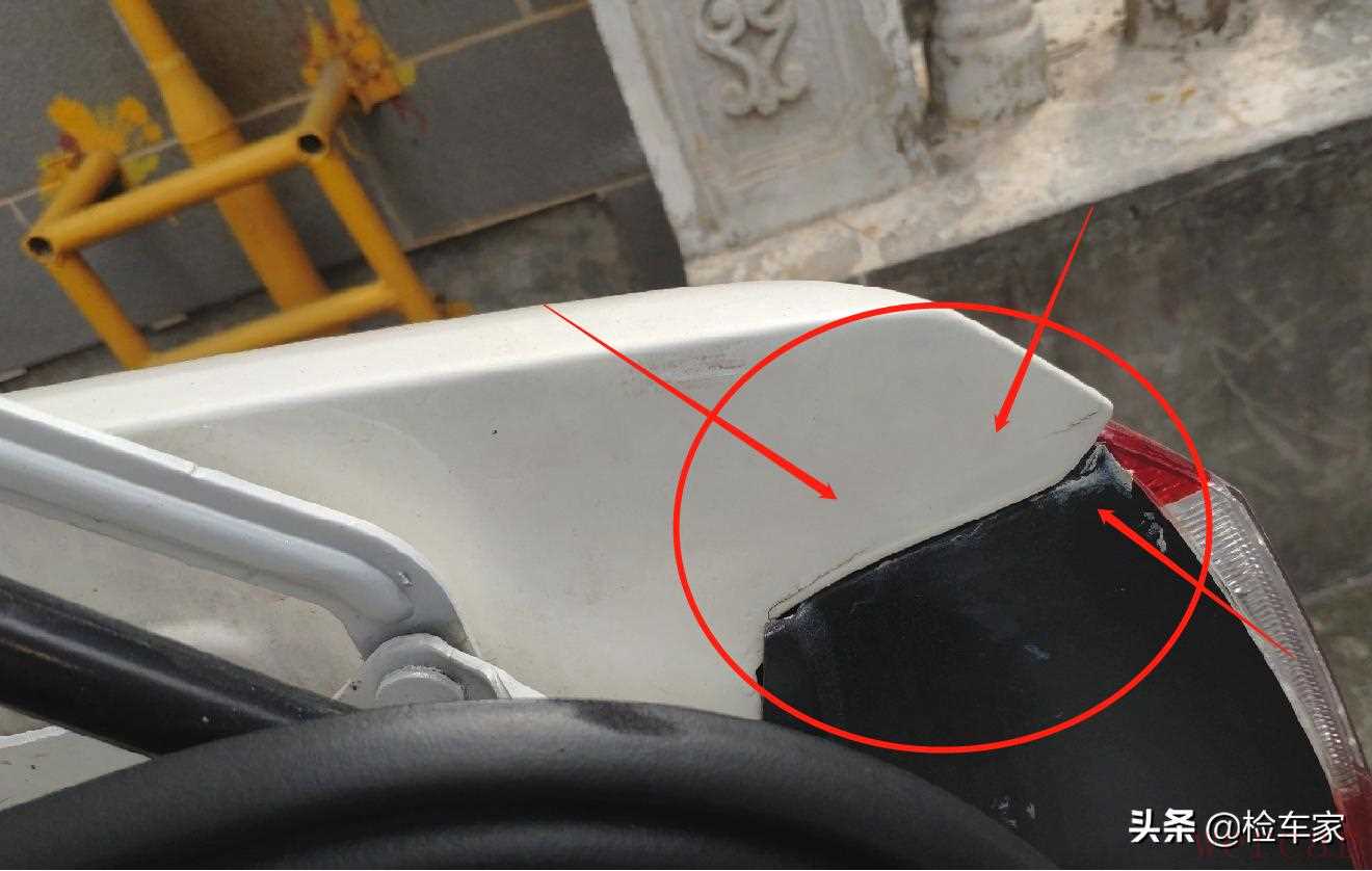 下面随着视线来到车辆后部,可以看到两边后尾盖固定螺丝都有拆卸拧动过,且内侧漆面存在飞漆毛刺,因此可以确定后尾盖属于后期更换的;还有左侧后叶子板导水槽的原车胶线还在,但是上面有存在流漆且腻子不太均匀,大概率是后面追尾导致的腻子修复,看来这车的故事还真不少!这个车屁股得好好看看了。