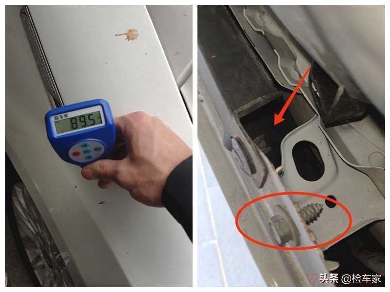 随后发现左右两边的叶子板漆面数值都比原车数值低,这种情况就属于后换的副厂件,因为副厂出来的东西就铁板一块,不像原车金属面会给你进行漆面上的一些处理;并且左右两边的叶子板固定螺丝都有拆卸过,内侧漆面是黑色,可以确定两边叶子板都有存在更换。才刚开始看,就给我这么大一个惊喜,目前大致可以确定车头是有碰撞的,至于有多严重就只有往下查看了。
