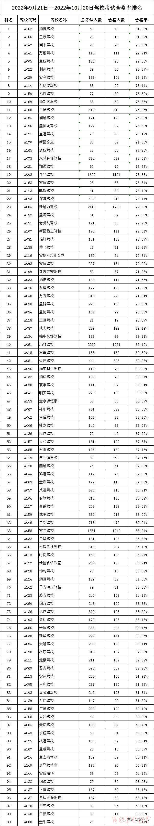 兰州市公安局交警支队车辆管理所现将2022年9月21日--2022年10月20日兰州市各驾校学员考试合格率排名公布如下: