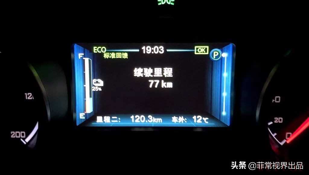 实际情况下,当电量下降至25%时行车电脑显示续航里程剩余77公里,此时已行驶120.3km,总的行驶里程接近200km,折损率约为35.31%。实际情况比理想状态要好,也算是一种安慰吧。