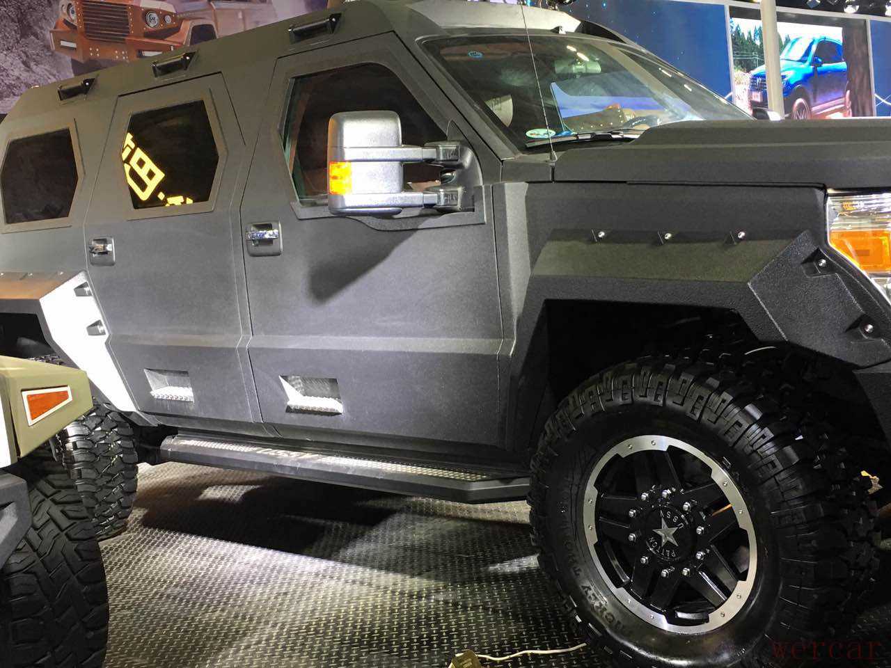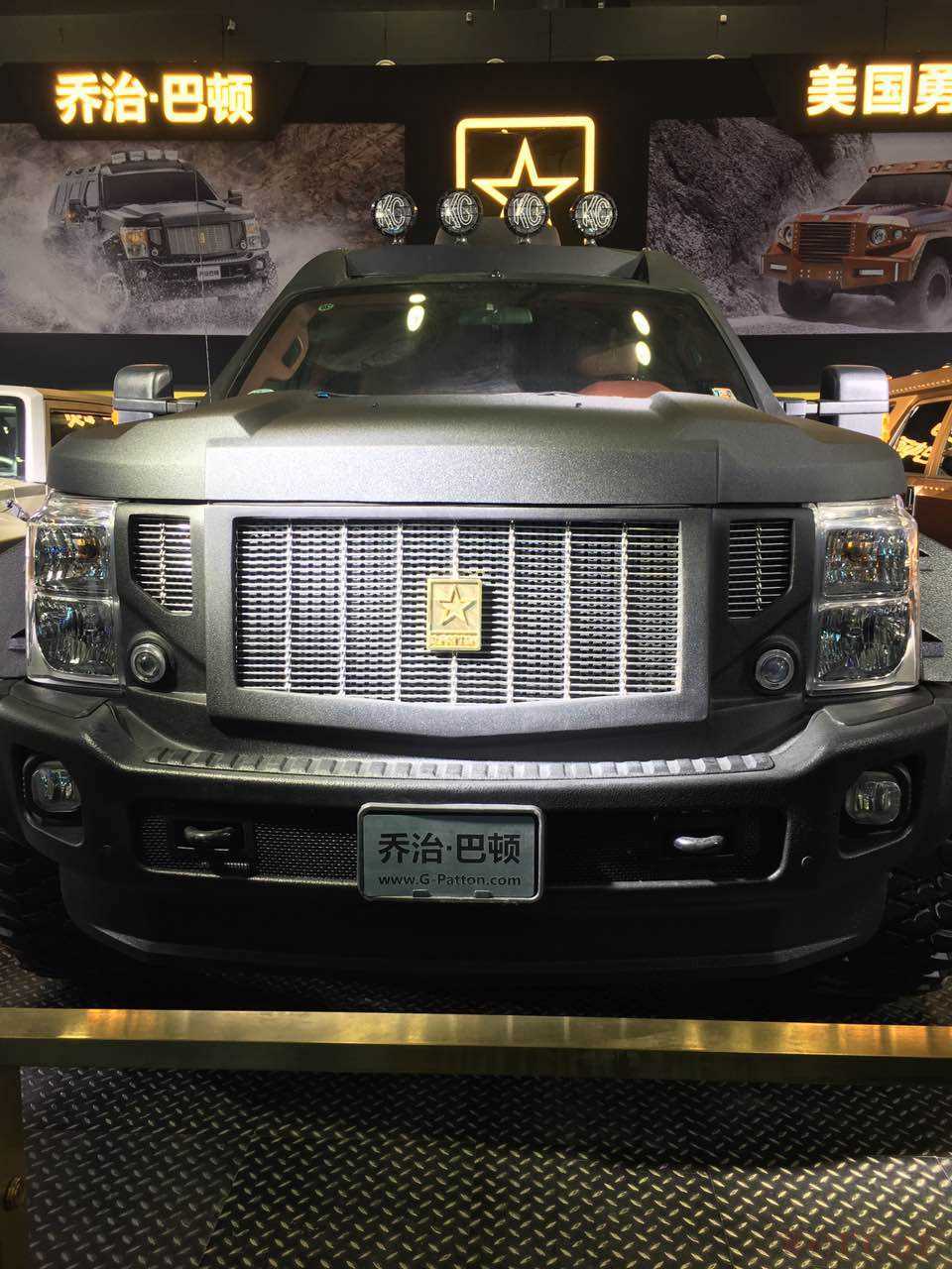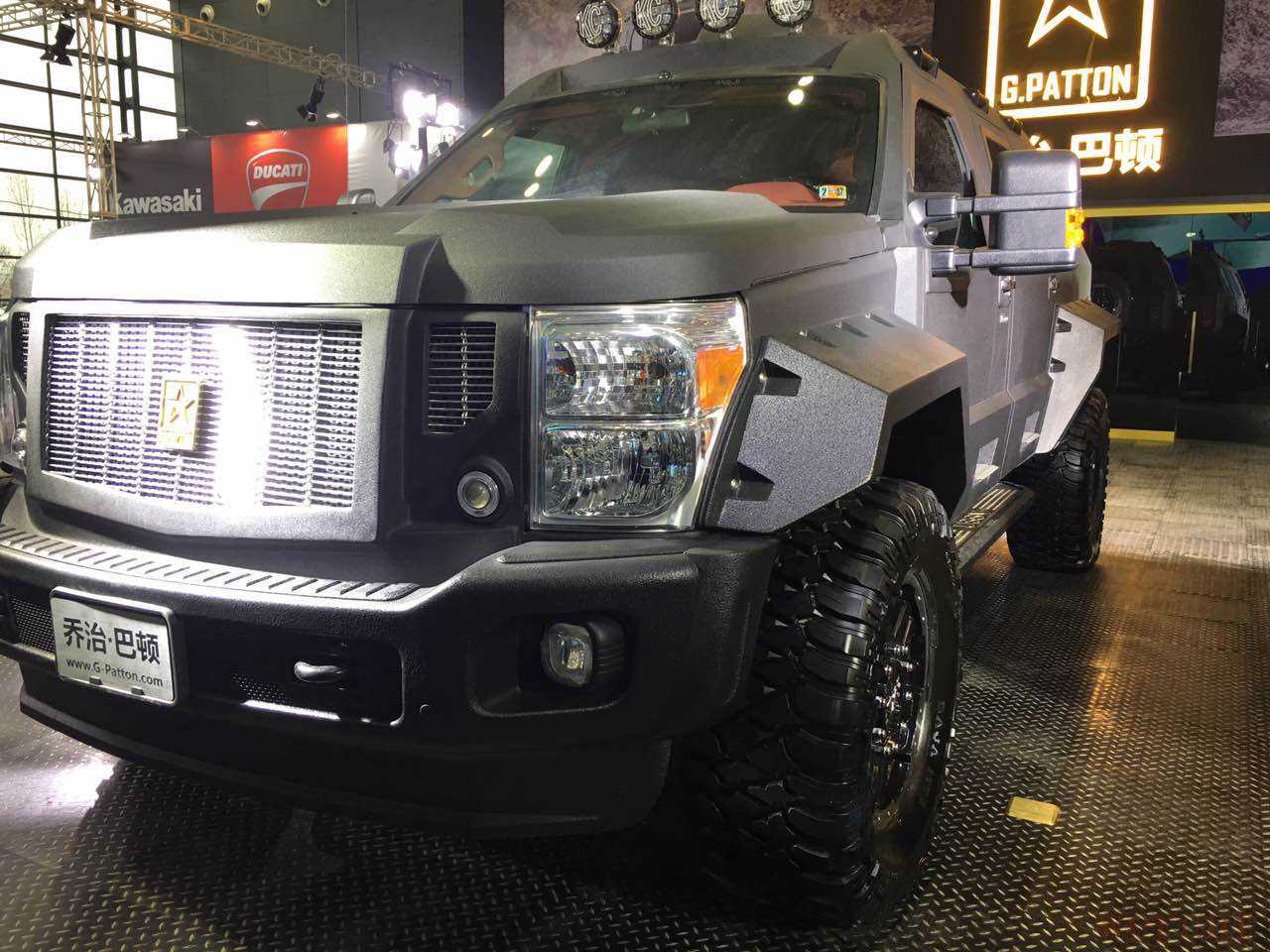 乔治巴顿越野车,基于福特F350改装而成,整车在保留F350越野特性的同时,车身框架经过了颠覆性的设计改造,车身线条更富棱角化,夸张的铆钉、高挑的轮眉、侧挂式备胎、特殊的前脸布局等一系列特殊符号凸显出车体的硬朗本色,这与它形似一部英勇善战的战车极为吻合。