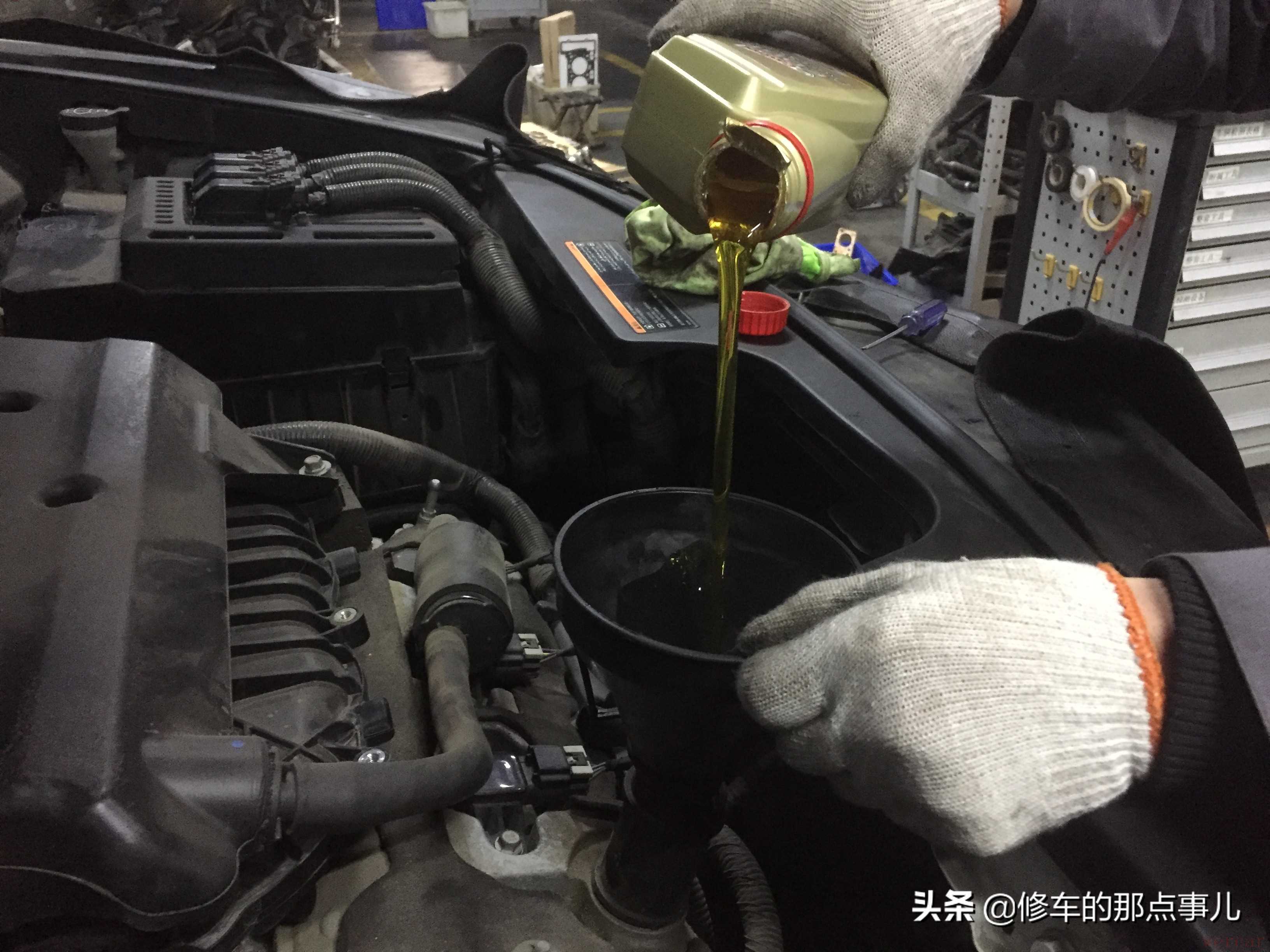 开始加注机油,SRX的发动机机油盖位置有一些刁钻。还是用个漏斗会比较准确一点,洒出来的机油清理起来很麻烦。