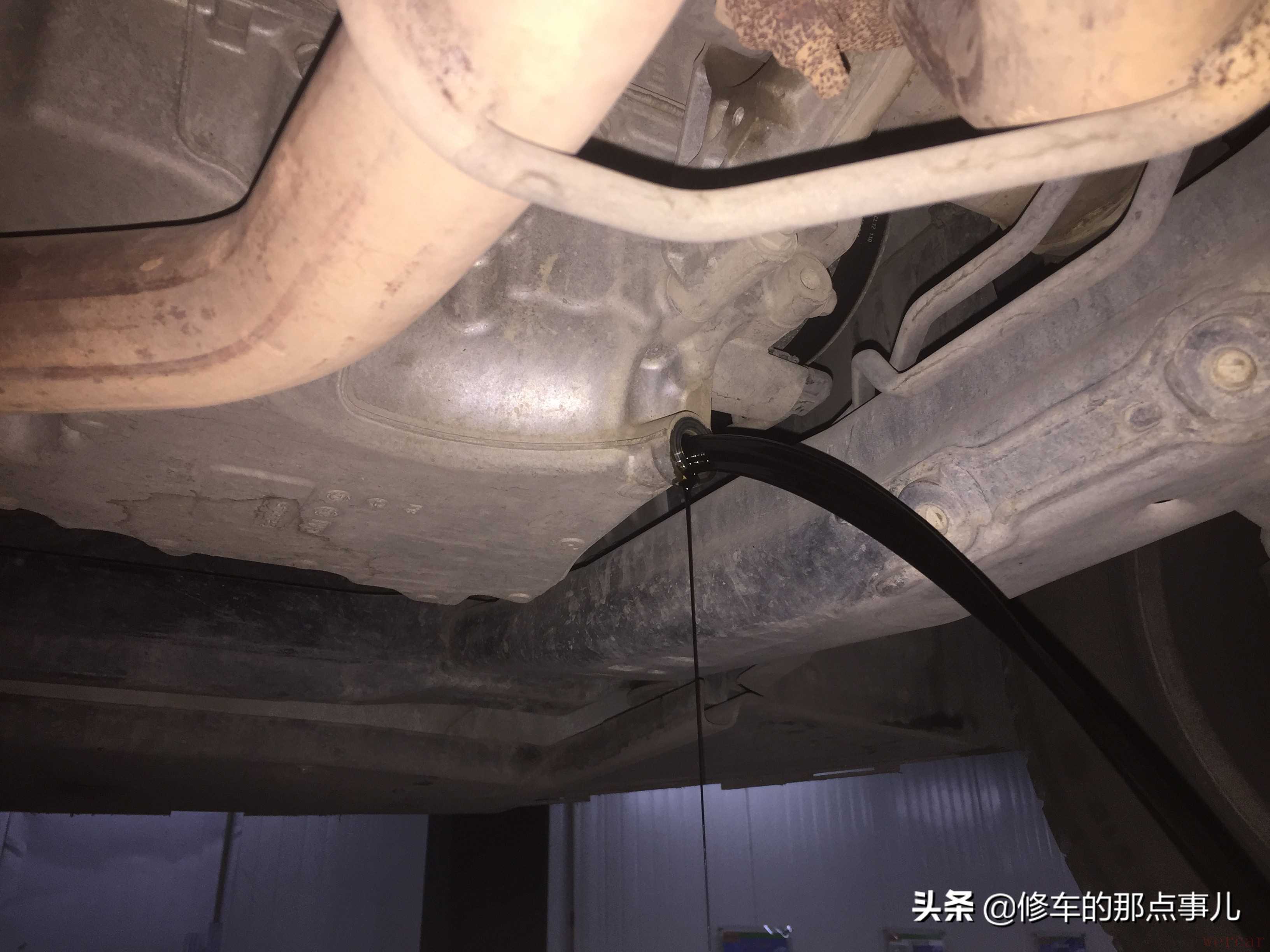 开始释放机油,在油底壳的最下方有一颗放油螺栓。松开就可以直接的释放机油了,机油的颜色已经很深沉,好在量还充足,说明发动机没有烧机油的情况。