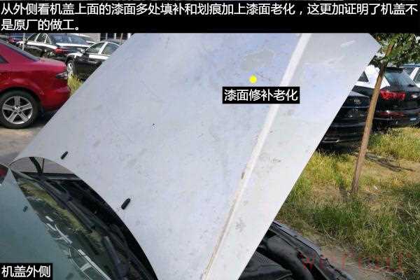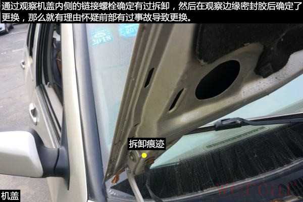 机盖作为前部最好看最简单最清晰的观测点是一定要看的,拆卸痕迹能辅助证明更换,再看机盖整体的质量和漆面就能完全判断是否更换,此车就是前部事故导致更换的机盖。