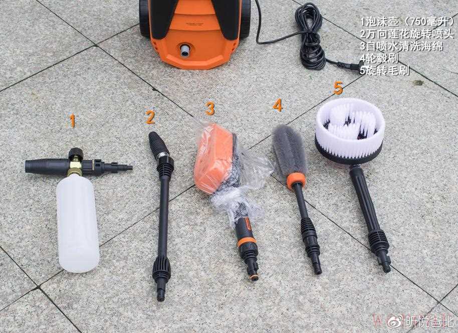 要想获得更佳的洗车体验,可以选购以下配件:750毫升泡沫壶、旋转毛刷、万向莲花旋转喷头、轮毂刷、自喷水清洗海绵。万向莲花旋转喷头可以360度旋转,喷出的旋转水型可以强力去污,是清洗车底和车顶的利器。旋转毛刷可以在一边喷水的同时进行旋转清洗,使得去污更彻底。轮毂刷可以在一边喷水的同时去清洗轮毂上不容易清洗到的边边角角。