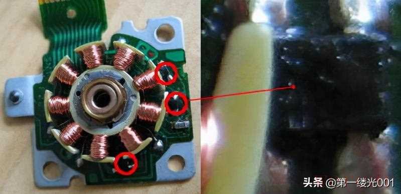 图片:这个旧软盘驱动器上的小型直流无刷电机有三个霍尔效应传感器(红色圆圈表示),它们位于电机的边缘,检测电机转子(一个旋转的永磁体)的运动(在这张照片上没有显示)。传感器不是很多看,正如你可以看到从特写照片在右边!