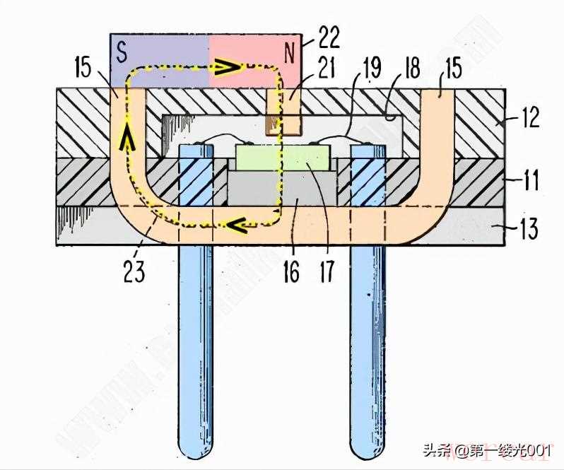 插图:典型的霍尔传感器是如何包装的。磁场可以非常小,所以我们需要我们的探测器尽可能地敏感,这是一种实现这一点的方法。霍尔芯片本身(绿色,17)安装在一个铁载体板(灰色,16),夹在两个成型的塑料部分(灰色,11,12)。芯片由引线(19)连接到终端引脚(蓝色),通过它可以连接到一个电路。但真正重要的部分是两个软铁“通量集中器”(橙色,15,21),这使得该设备非常敏感。当你在传感器附近放置一块磁铁(22)时,这些集中器允许磁通量(磁场产生的磁场的“密度”)沿着霍尔芯片的一个连续环路流动,产生正电压或负电压。如果磁铁滑到传感器的另一侧,就会产生相反的电压。