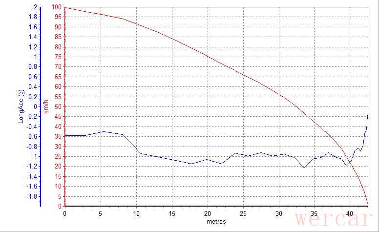 刹车的整体表现一般,制动效果前段偏弱,中后段维持在-1.0g左右。最终的100km/h-0的刹车成绩为42.69米,表现稍差。究其原因,我认为迈腾所搭载的这套泰Ventus S1 evo2轮胎虽然是运动趋向,但抓地力一般,在弹射起步时也出现了持续打滑的现象。