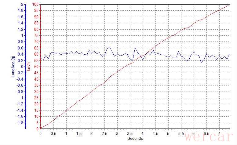 起步时由于持续性的打滑,所以迈腾的加速G值并不高,仅为0.4g左右。在2.7秒时加速G值达到峰值0.6g,此时迈腾的加速感非常强烈。经过了多轮的测试,迈腾0-100km/h加速时间为7.41秒,表现不错。