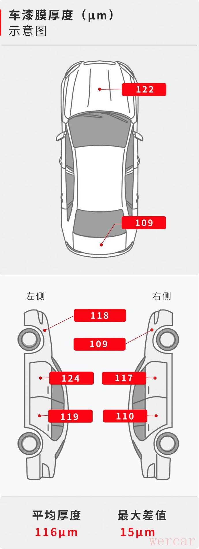 漆膜厚度方面,更厚的漆膜能在遇到轻微剐蹭时更好的保护车漆,实测新迈腾的平均漆膜厚度为116μm,在同级别属于了良好水平。漆膜最大差值为15μm,说明车身漆膜喷涂比较均匀,喷涂工艺成熟。