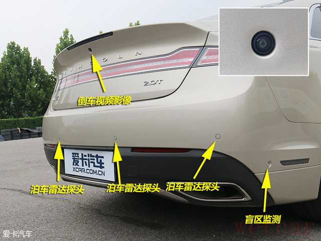 林肯MKZ车尾同样拥有四个泊车雷达探头外加两个盲区监测探头,同时在行李厢上拥有一个倒车视频影像摄像头。