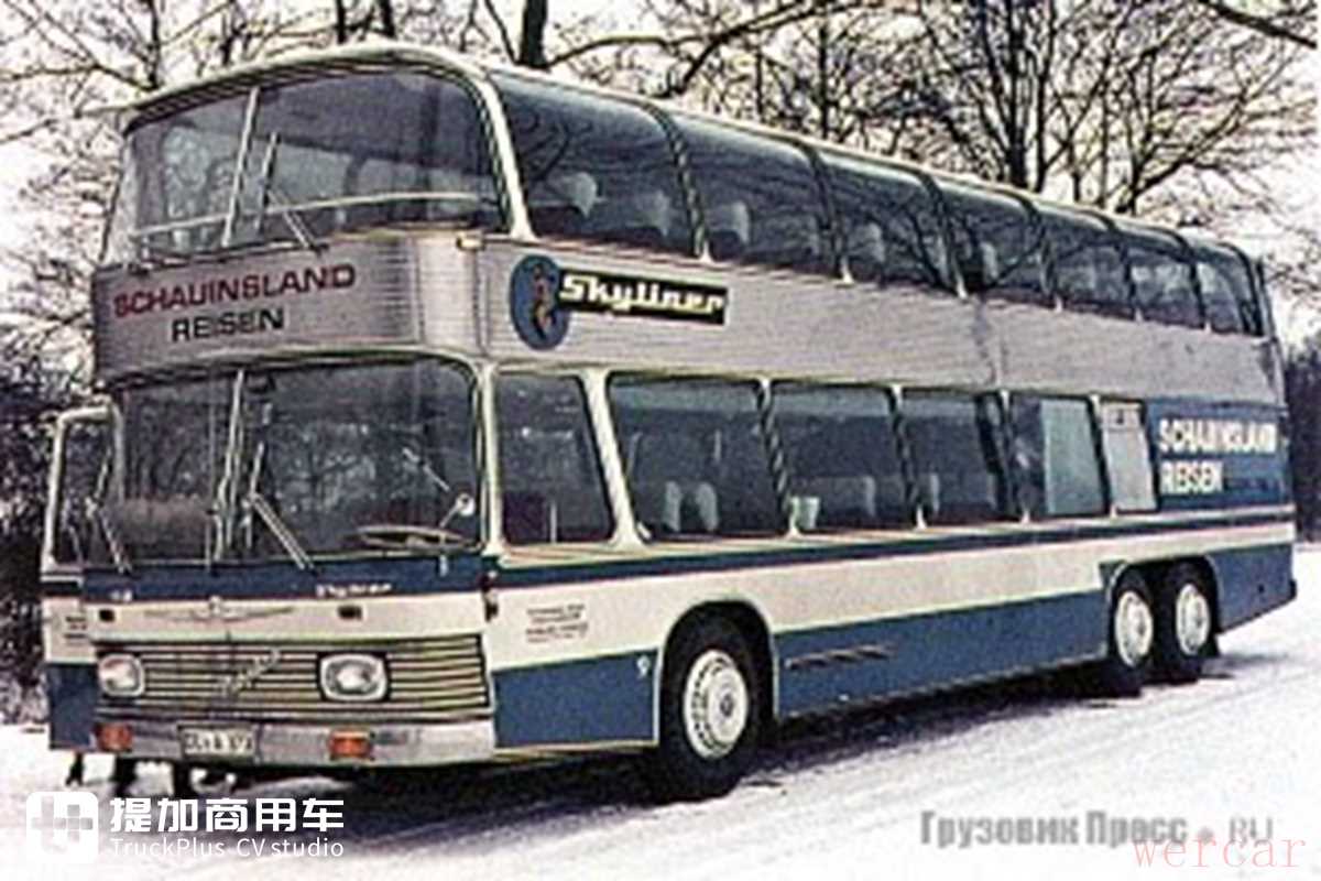 1978年,应智利客户的要求,NEOPLAN推出迄今为止最具重量级的Skyliner N128/4超大型豪华双层巴士,整车长度14.36m。值得一提的是,从这一车型开始,skyliner已经采用镂空式透明车顶,于此同时,空调的加入使得原有的推拉窗得以取消。