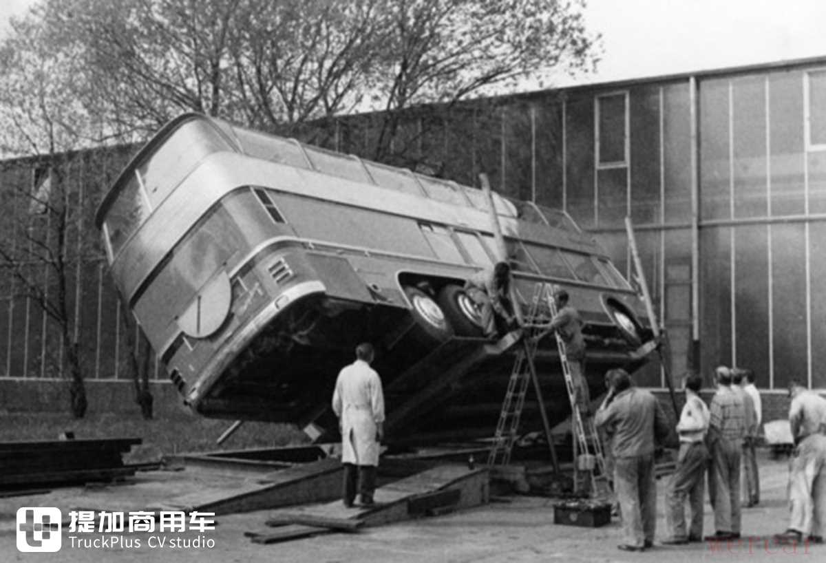 同一时期除了两轴车型外,NEOPLAN还根据市场需要推出客容量更大的Skyliner NH22-L三轴车型。当时车型设计特点十分明显:上下两层前挡风玻璃均带有立式雨刷。图为1968年,NEOPLAN对NH 22/3车型进行倾斜试验,当时倾斜角度极限可以达到28度。进行此次试验的目的,主要是考虑到双层巴士所具有的高重心,在特殊路况下所带来的安全性问题。