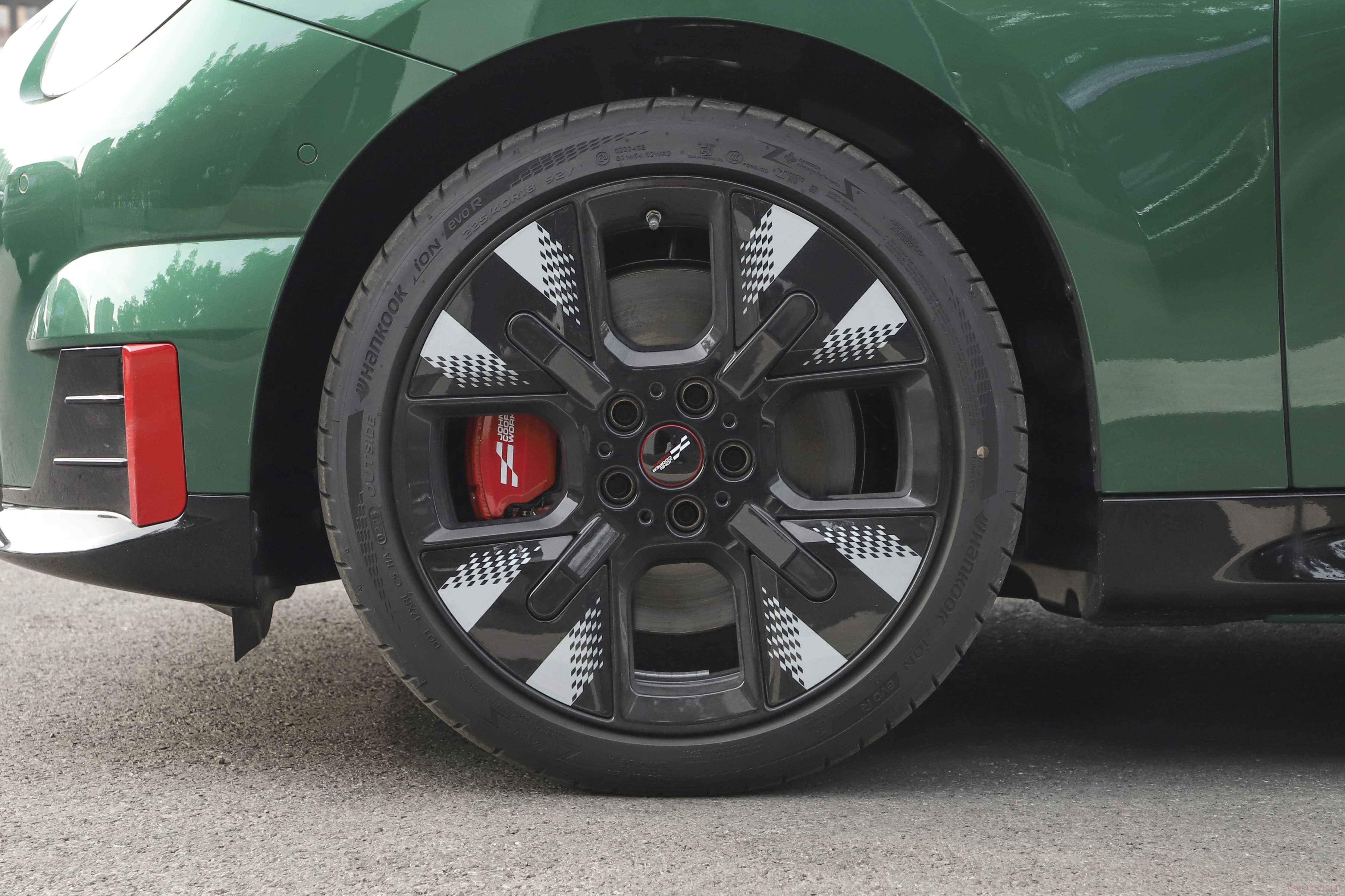 电动MINI JCW长宽高分别为3863/1756/1458毫米,轴距为2526毫米,与在售普通版车型相比,该车车长增加5毫米,其他数据保持不变,定位于小型车。同时,该车还配备带有黑白方格旗元素的18英寸轮辋,并搭配红色制动卡钳,轮胎尺寸为225/40 R18。