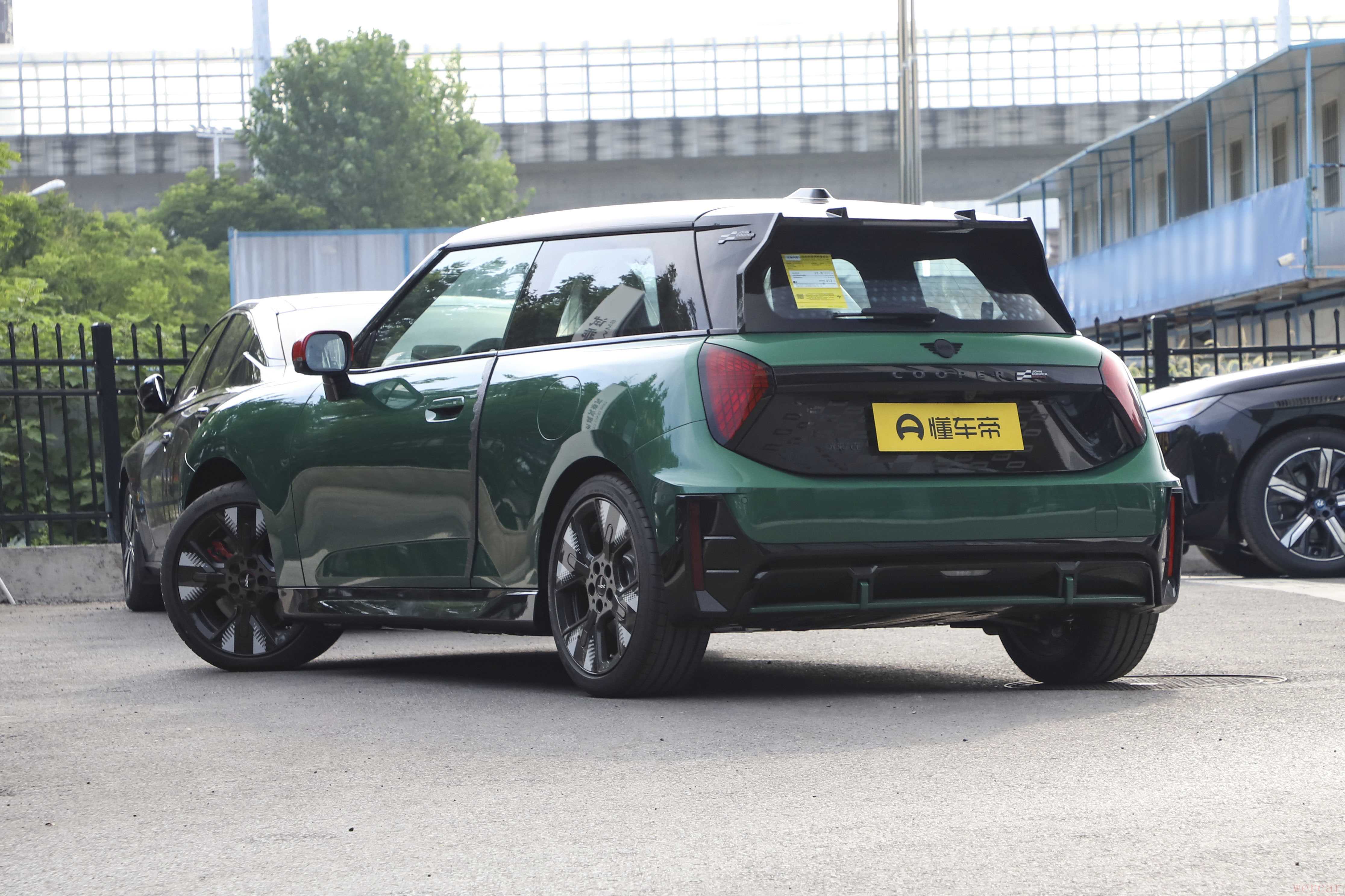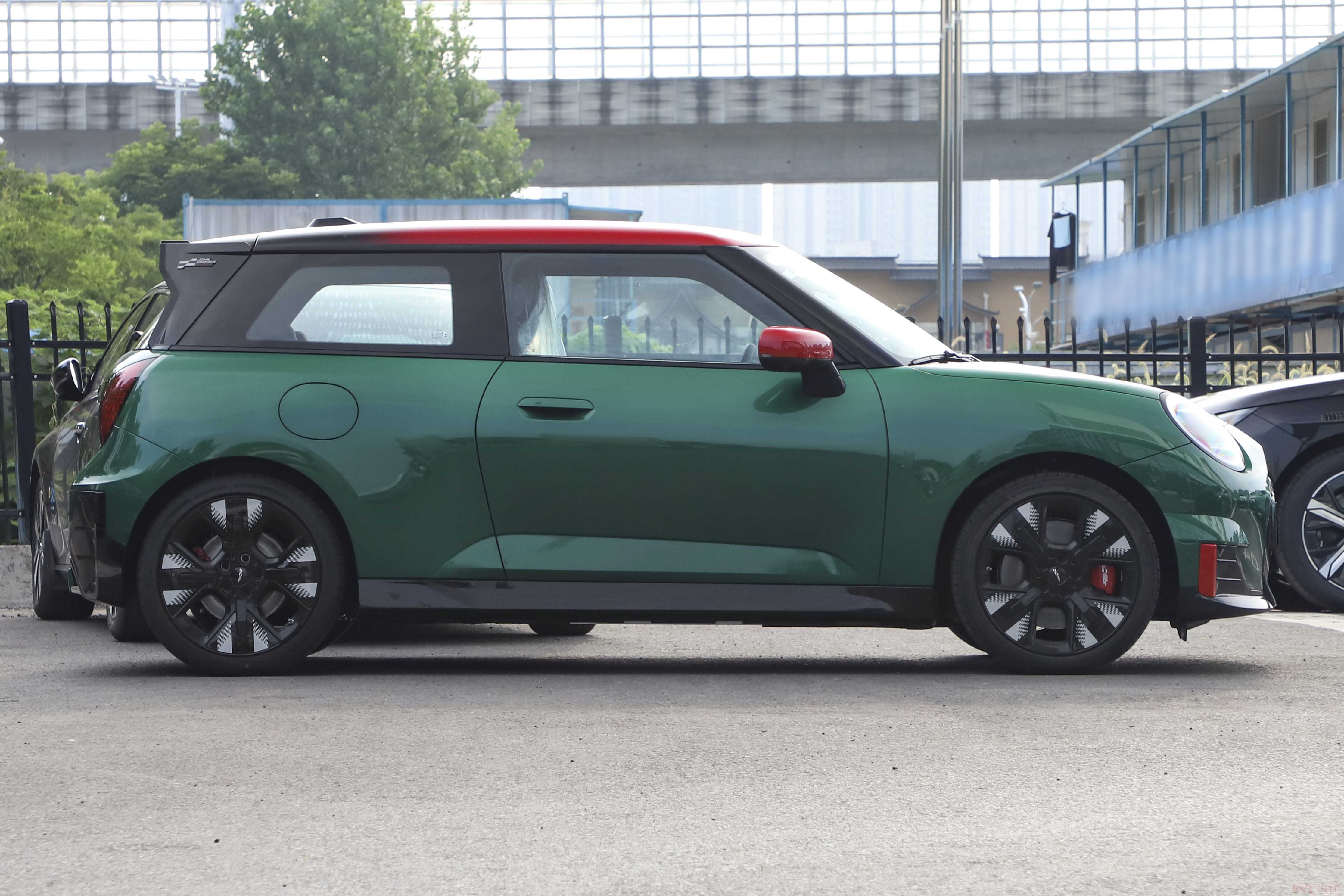 电动MINI JCW车侧相比普通版车型变化不大,侧裙边加入导流板,根据车款不同提供全景天窗或渐变色车顶选择。尾门使用了大面积的黑色涂装,并增加了JCW方格旗元素徽标,后包围加入黑色导流板。另外,该车在车头、C柱、车尾均配备有JCW专属标识,前后车标也进行了黑化处理。