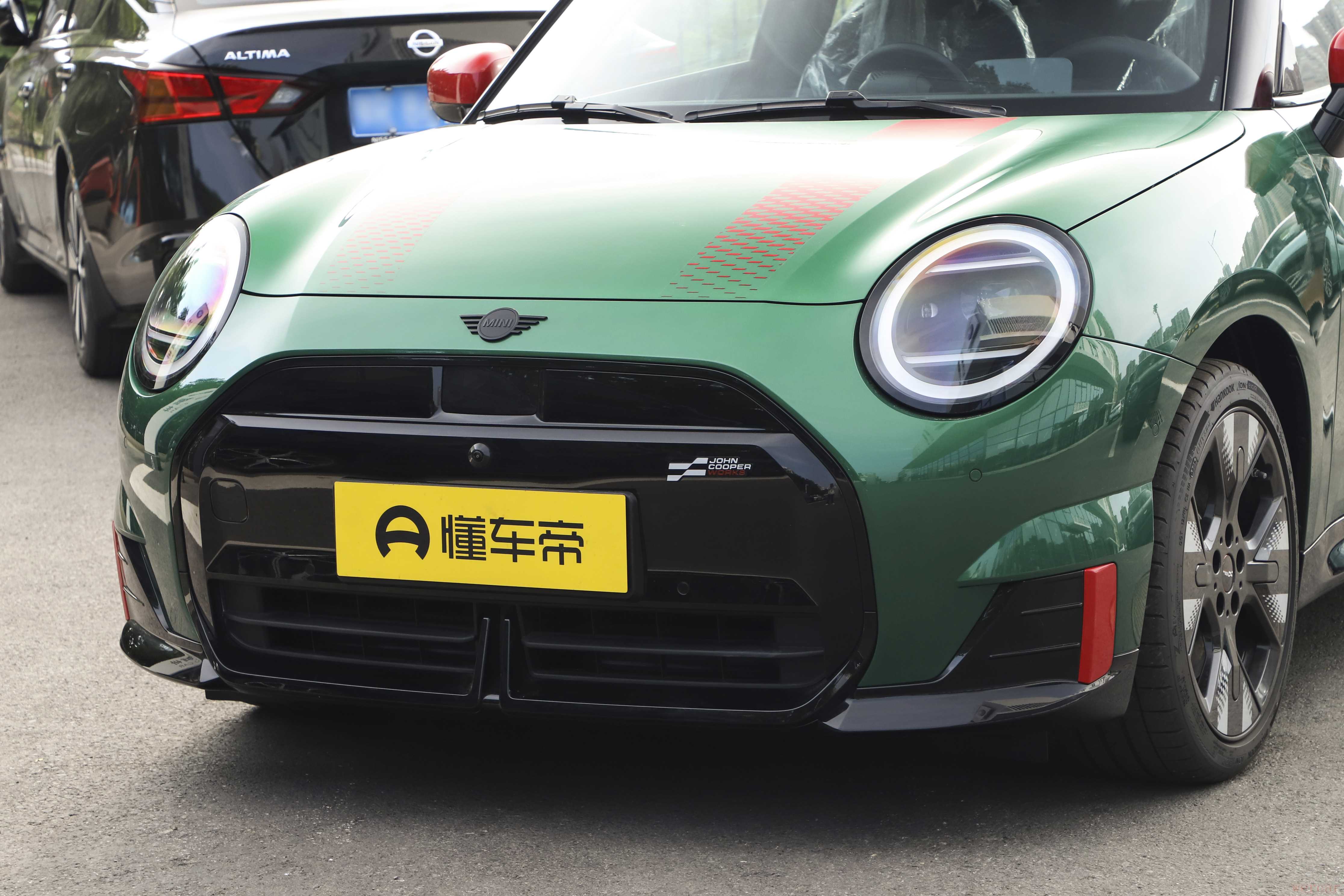 目前,我们尚未拍摄到新款电动MINI JCW的实车图片,但新车在外观和内饰设计方面与老款车型保持一致。参考老款车型,电动MINI JCW继续采用三门布局,车头配有标志性圆形LED日行灯,车头八边形中网内部配备黑色饰板,下方进气口造型有所调整,两侧还带有红色装饰件。此外,新车前机舱盖可选点阵样式拉花。