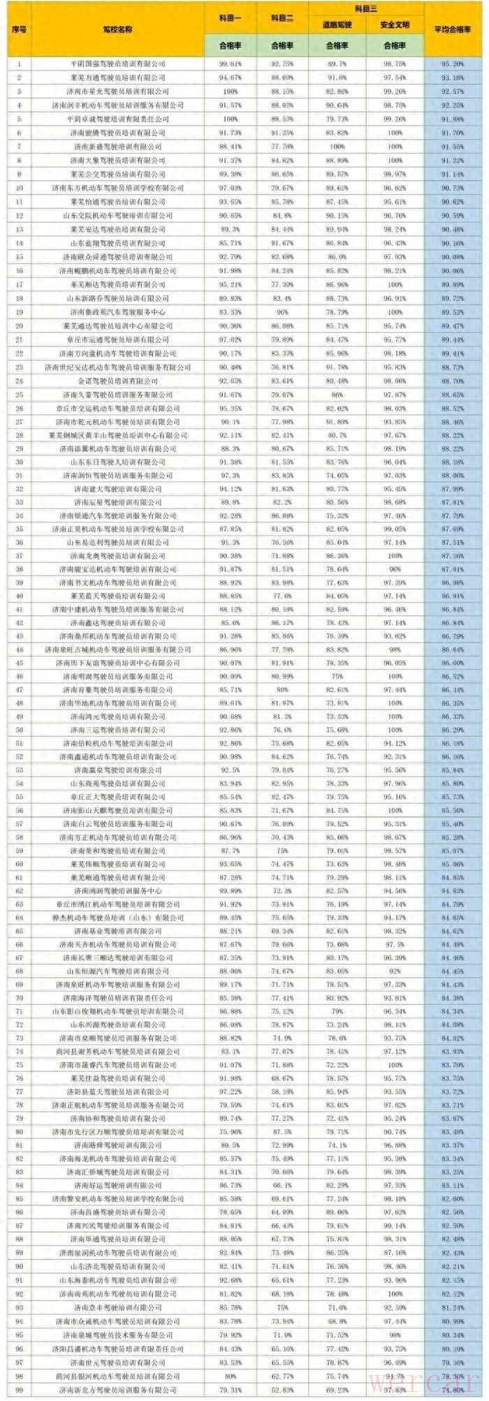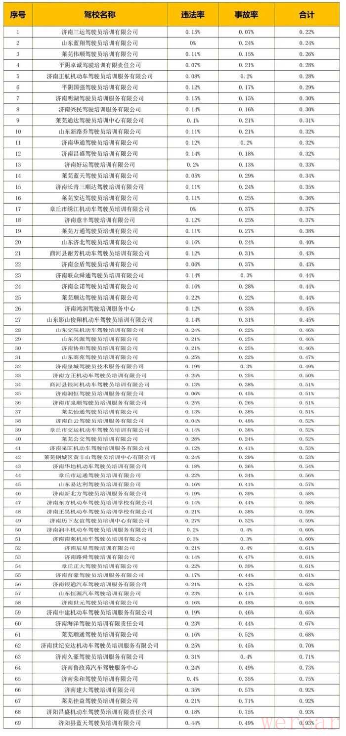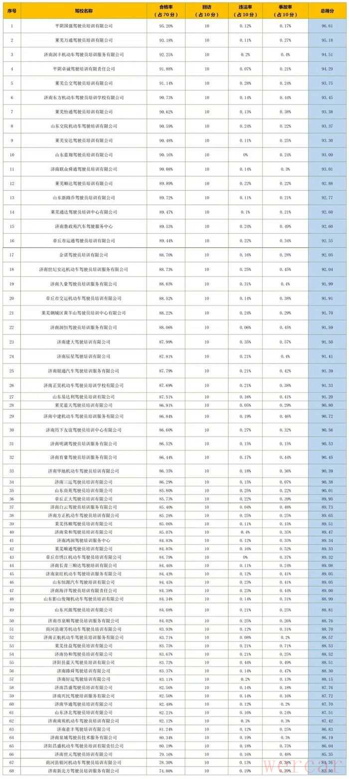 2、济南市顺鑫机动车驾驶员培训有限公司、山东启尧机动车驾驶员培训有限公司因考试人数较少暂不排名。