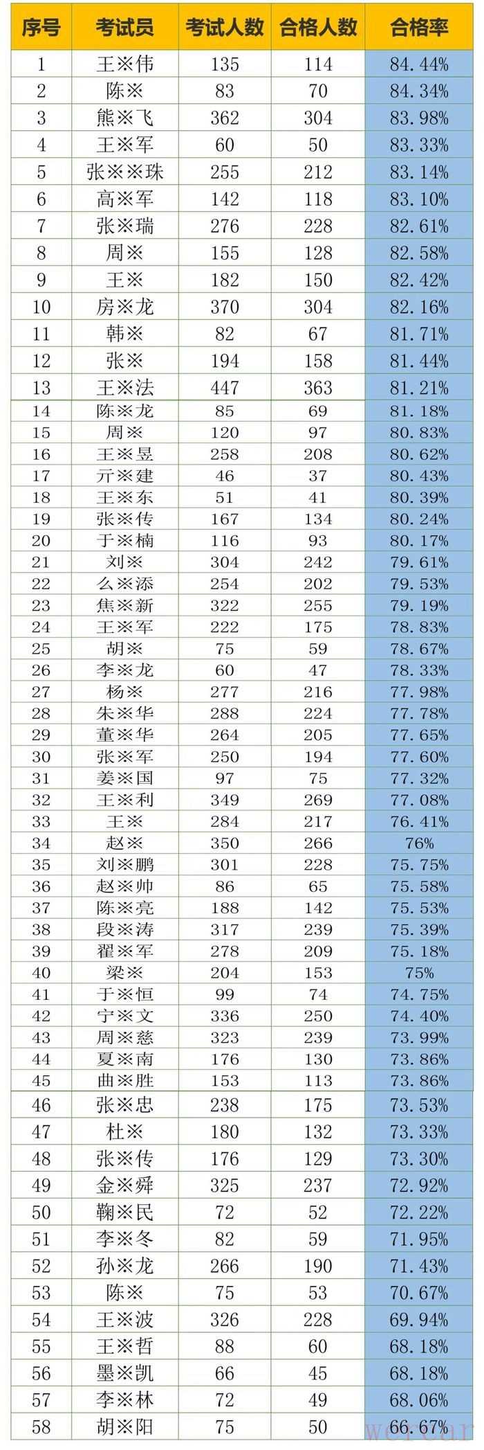 此外,在7月份考试员考试质量排名中,最高者合格率为84.44%。