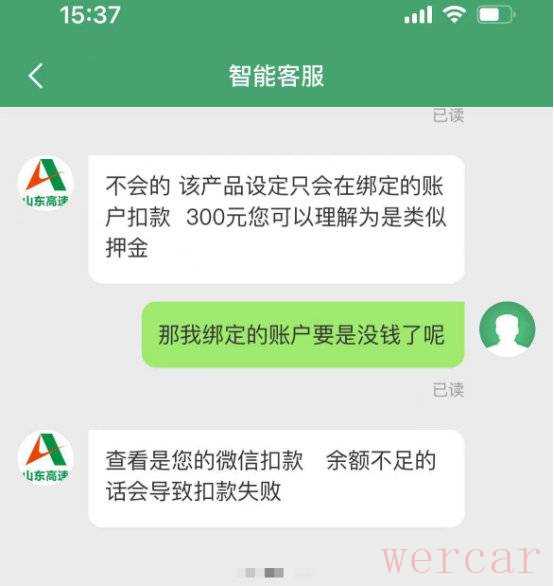 疑惑之下,张先生通过“e高速”手机客户端联系了客服。客服称,该产品设定只会在绑定的账户扣款,300元可以理解为押金。于是,张先生提出了要注销账户,对方却表示,这笔费用为奖励金,需要要满60个使用月后,办理注销时输入银行卡号进行领取。这也意味着,张先生要在使用满60个月后,注销该业务才能申请全额退款。“办理的时候,完全没有告知这些情况。”张先生说。
