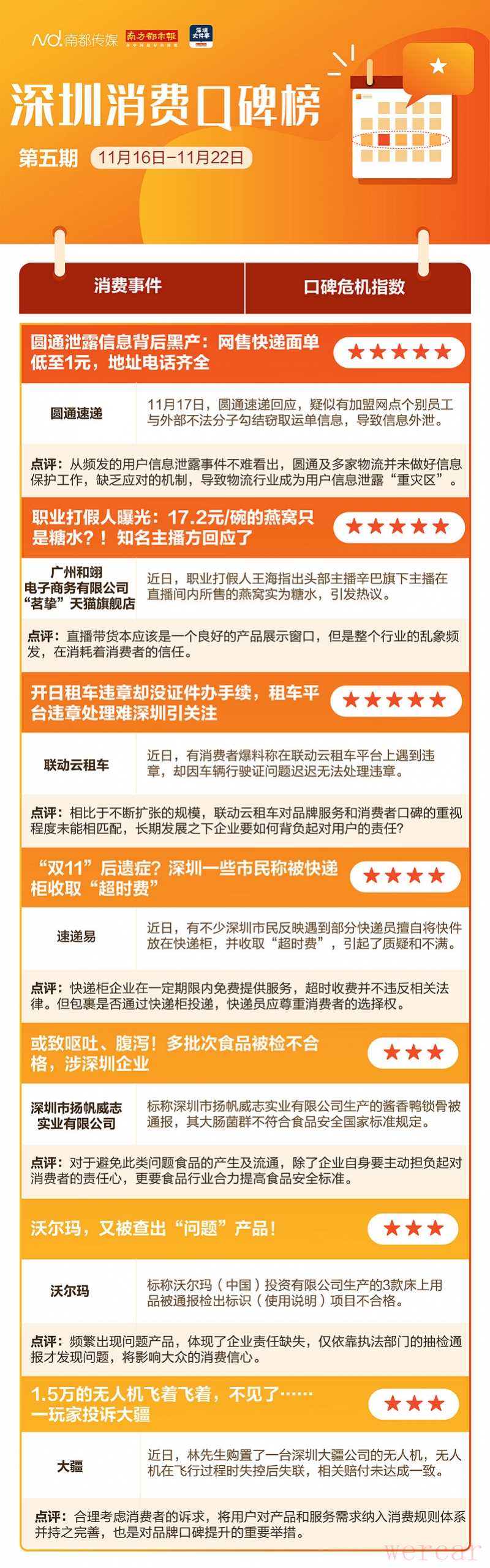 南都深圳大件事通过大数据、消费者、权威平台反映的消费信息,每周推出“消费口碑榜”。构建消费者参与、媒体监督的榜单栏目,旨在聚焦消费者声音,让消费者的意见系统性呈现,为企业服务方向给予参考,为消费者的消费选择提供指导。