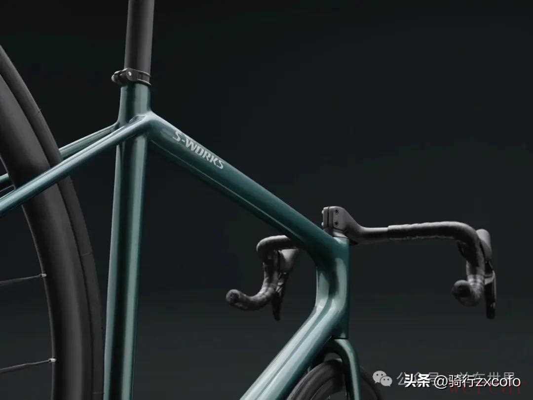 轮胎间隙增加了 —— 从 32 毫米增加到 35 毫米。作为对几何结构重新思考的一部分,头管也加高了 15 毫米,给车架增加了更多材料。为了应对重量的增加,座管夹(减重 9 克)、刹车安装座(减重 2 克)和中轴碗组(减重 6 克)都有小幅减重,还有定制的后拨导板(减重 2 克)。总体而言,采用 Specialized 的 Fact 12r 碳纤维制成的 S-Works 车架,56 厘米尺寸的据说重 595 克,仅比上一代车型重 10 克。