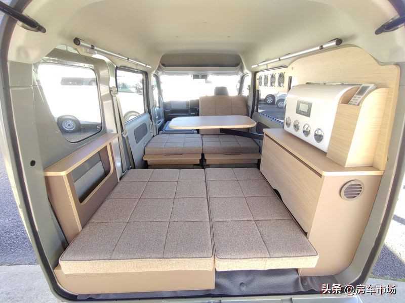 驻车休息时可以将后部的垫子铺到前面,座椅放倒,移走桌台,一张1.9*1.2米的床位就拼好了,睡下两人略显拥挤。