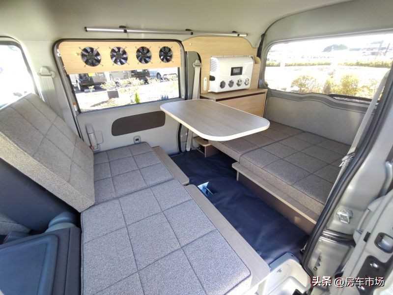 来看看车内的具体情况,进入车内首先看到的是后排座椅,两个座椅可翻折,驻车时放下后可以和后部形成会客区,轻松坐下3~4人,中间是移动桌台,吃饭看书很方便。