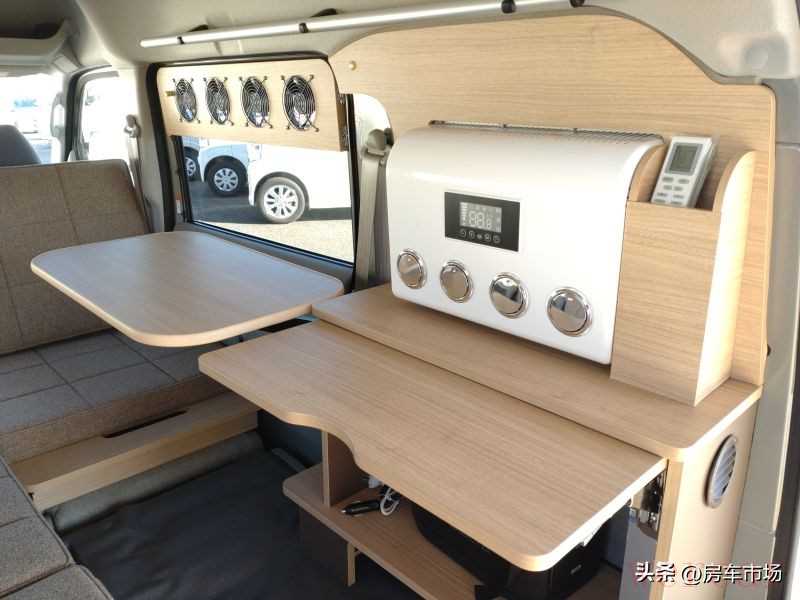 车尾侧面设置了一台车载空调,下部的台面可以利用,两张桌台放到一起,尺寸也不小,正好配合L型沙发使用。
