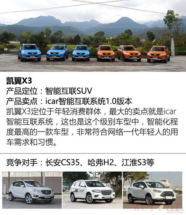 “凯翼”对大家来说也许还是个陌生的品牌,但提到奇瑞大家就很了解了,“凯翼”是奇瑞控股下的一个全新品牌,它于2014年品牌发布。凯翼X3就是它推出的一款全新车型,它和瑞虎3来自于同一平台,即与奇瑞共享技术,同时又体现了“凯翼”主打年轻化的品牌理念。如果说,瑞虎3适合于家庭用户或者年纪稍大的人群,也就是以实用性为主,那么,凯翼X3则更加贴近年轻人的用车需求,它主打的是“智能互联”这个理念。