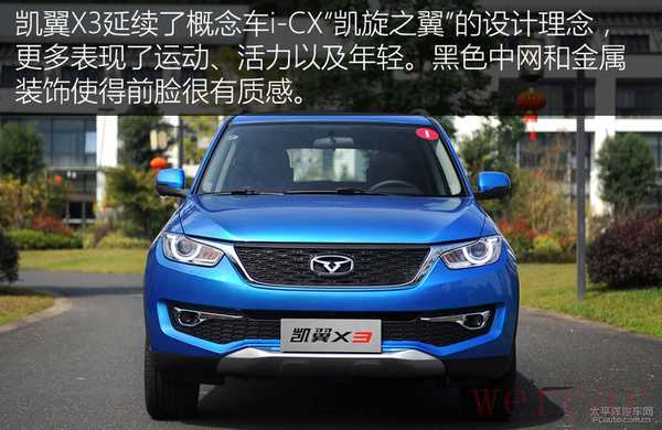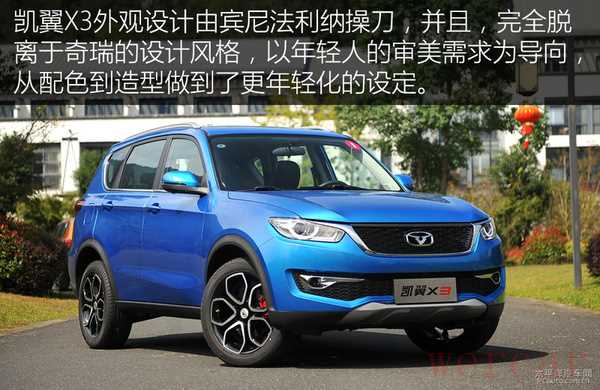 凯翼X3的外观设计聘请了宾尼法利纳(Pininfarina)的首席设计师罗威•维赫米斯赫操刀,虽然与瑞虎3同一平台,难免在车身轮廓和结构上有相似的地方,但两款车在外观上的差异还是很明显的。凯翼X3更突出年轻化的特点,定位也以年轻消费群体为主,与稍显平庸的瑞虎3形成了鲜明的对比。