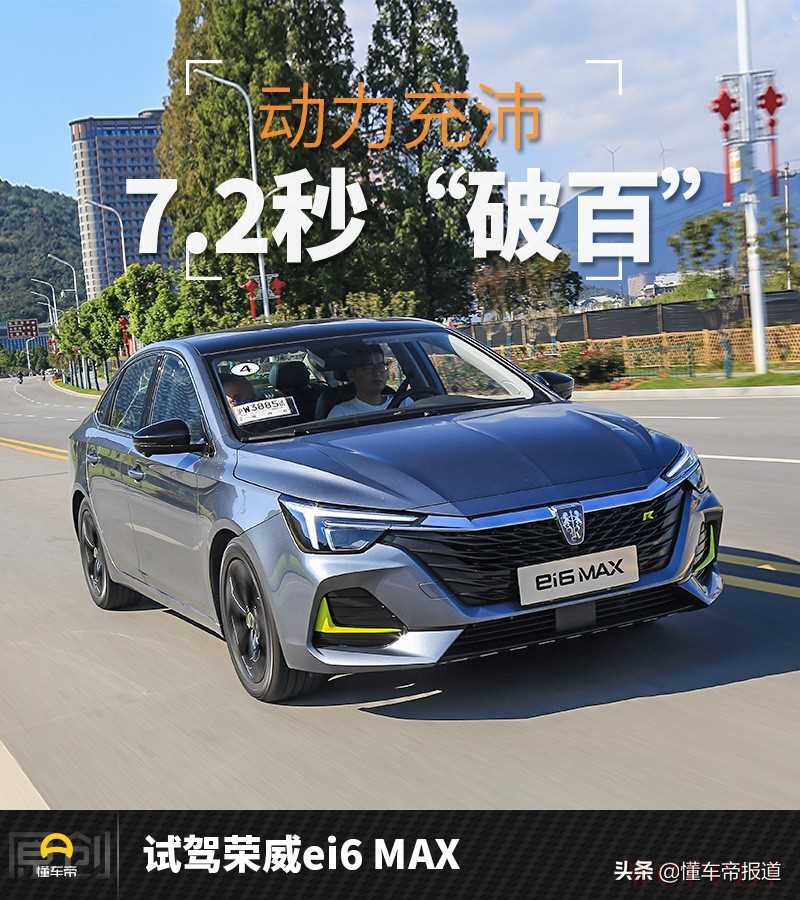 这是一篇关于荣威ei6 MAX的试驾体验文章,重点突出了其动力充沛和7.2秒零百加速的性能: