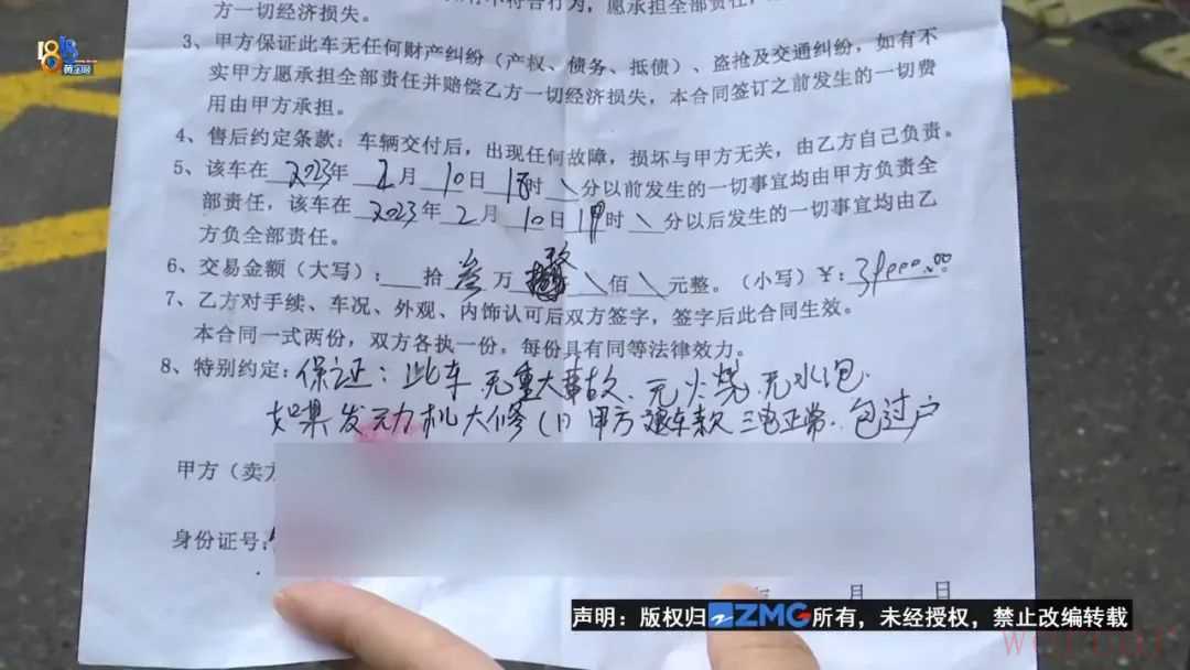 仪表盘显示,这辆车的公里数是八万多。但先生说,付完钱就把车开走了。合同上显示,卖车的人是一位蔡先生,备注:此车无重大事故,无火烧,无水泡,如果发动机大修,退车款。