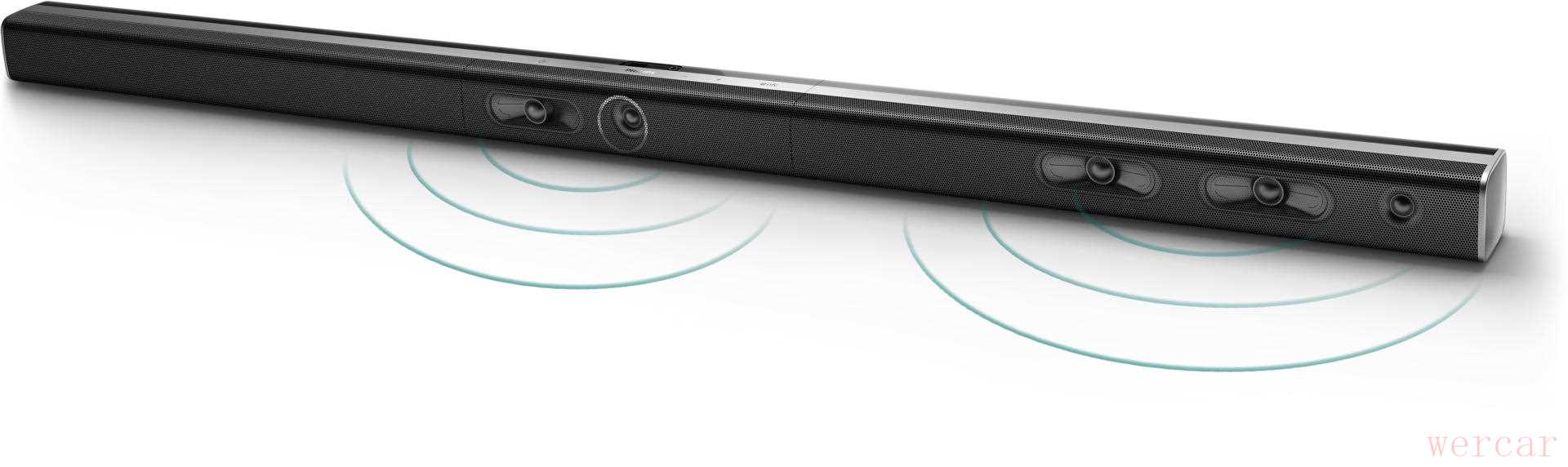 2、Soundbar回音壁是一种比较省事的环绕立体声的整体解决方案,尤其是现在的很多Soundbar本身已经具备多声路多单元发声单元,可以通过算法以及墙面反射的方式来实现类似上面的环绕全景声音箱效果。只不过Soundbar一般是由多个小口径、低功率的发声单元,所以看片还凑合,但用来听歌就差点意思了;