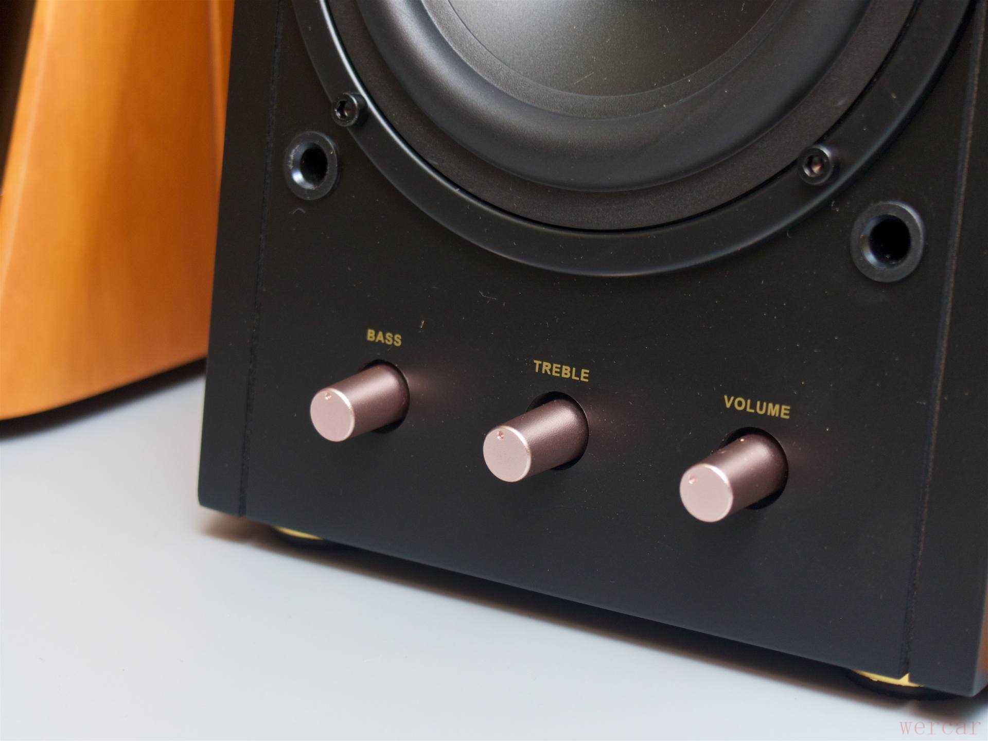 作为一款家用影音娱乐用音箱,M200MKIII+右侧主箱的面板上提供了3颗调节用的电位器,其中【BASS】是用来控制低音水平,【TREBLE】则是控制高音水平,剩下的【VOLUME】则是控制整体的输出电平音量。