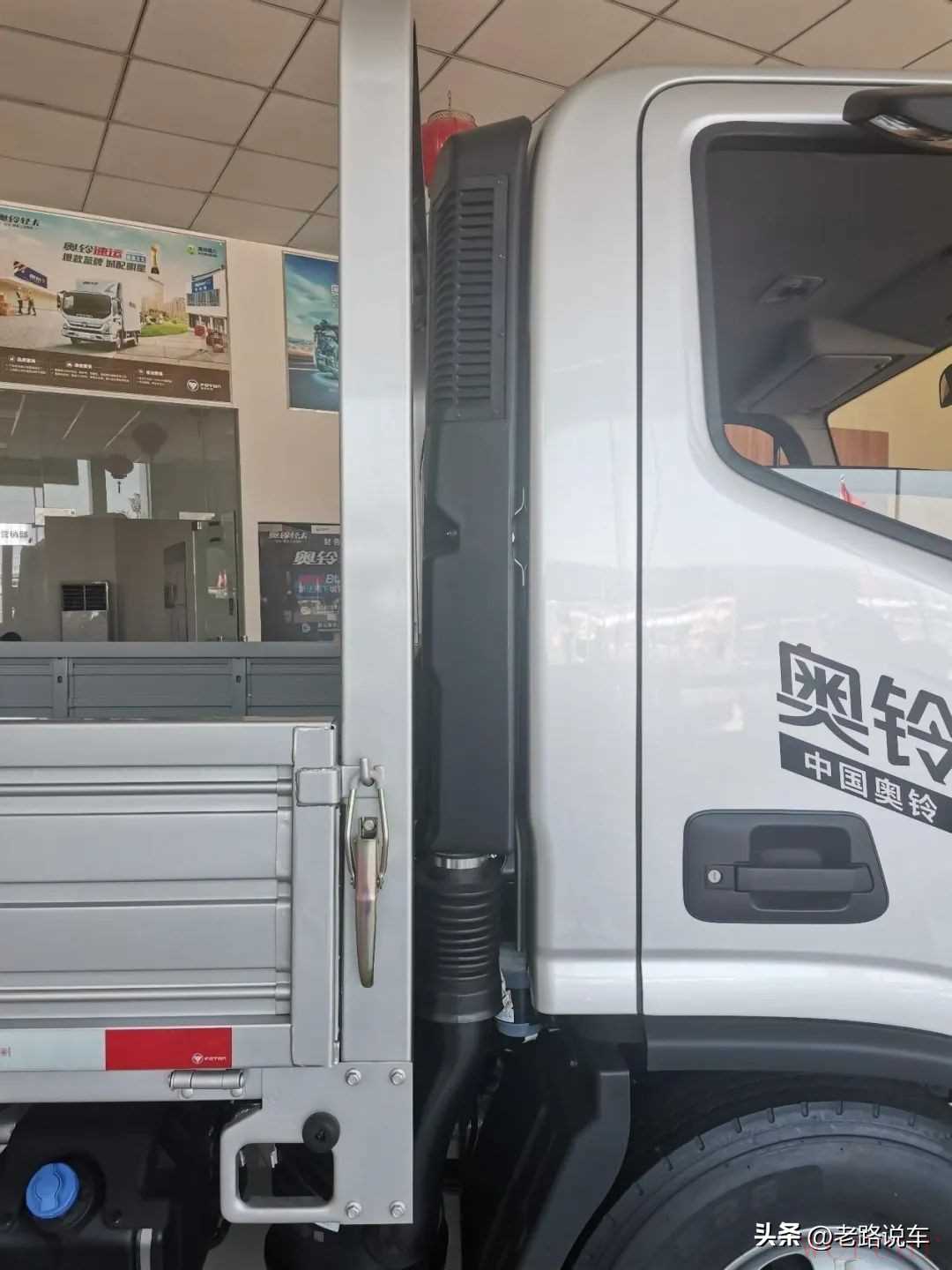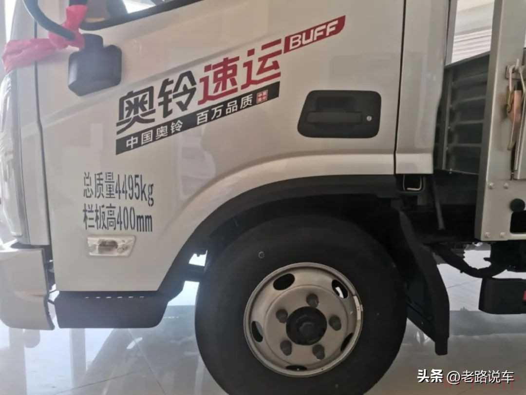 车辆侧面全览实拍的奥铃速运BUFF版轻卡采用栏板上装,横瓦楞三开门设计,栏板高度为400mm。对于城配用户来说,栏板上装能装载各式各样的货物,具备超强的灵活性。