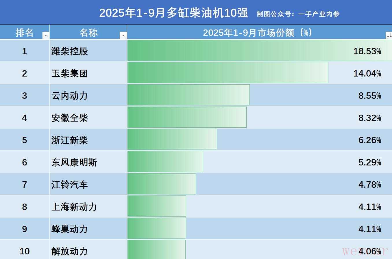 另附:2025年1-9月我国多缸柴油机市场份额排名,数据源于:中国内燃机协会。