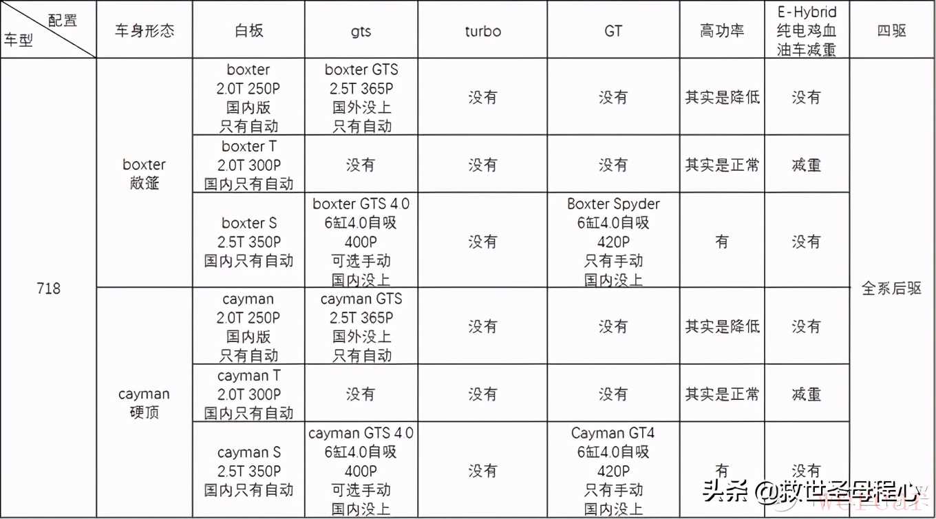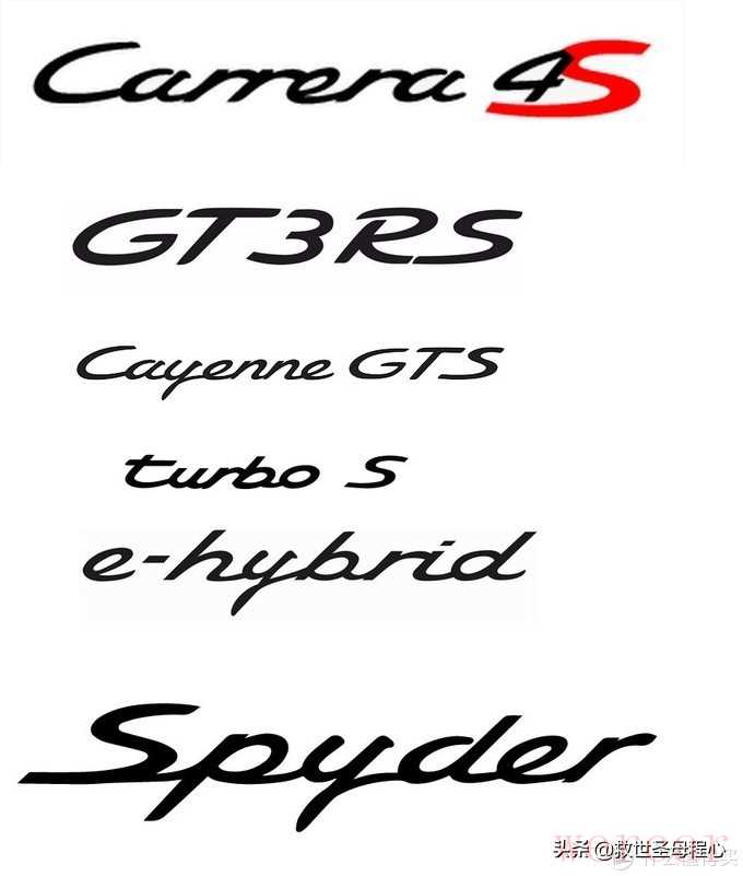 后缀方面,主要有区分四驱与否的4,高功率与否的S,低配白板,中配的gts,高配turbo,以及gt+数字的gt系列,混动的e-hybrid和sypder系列。