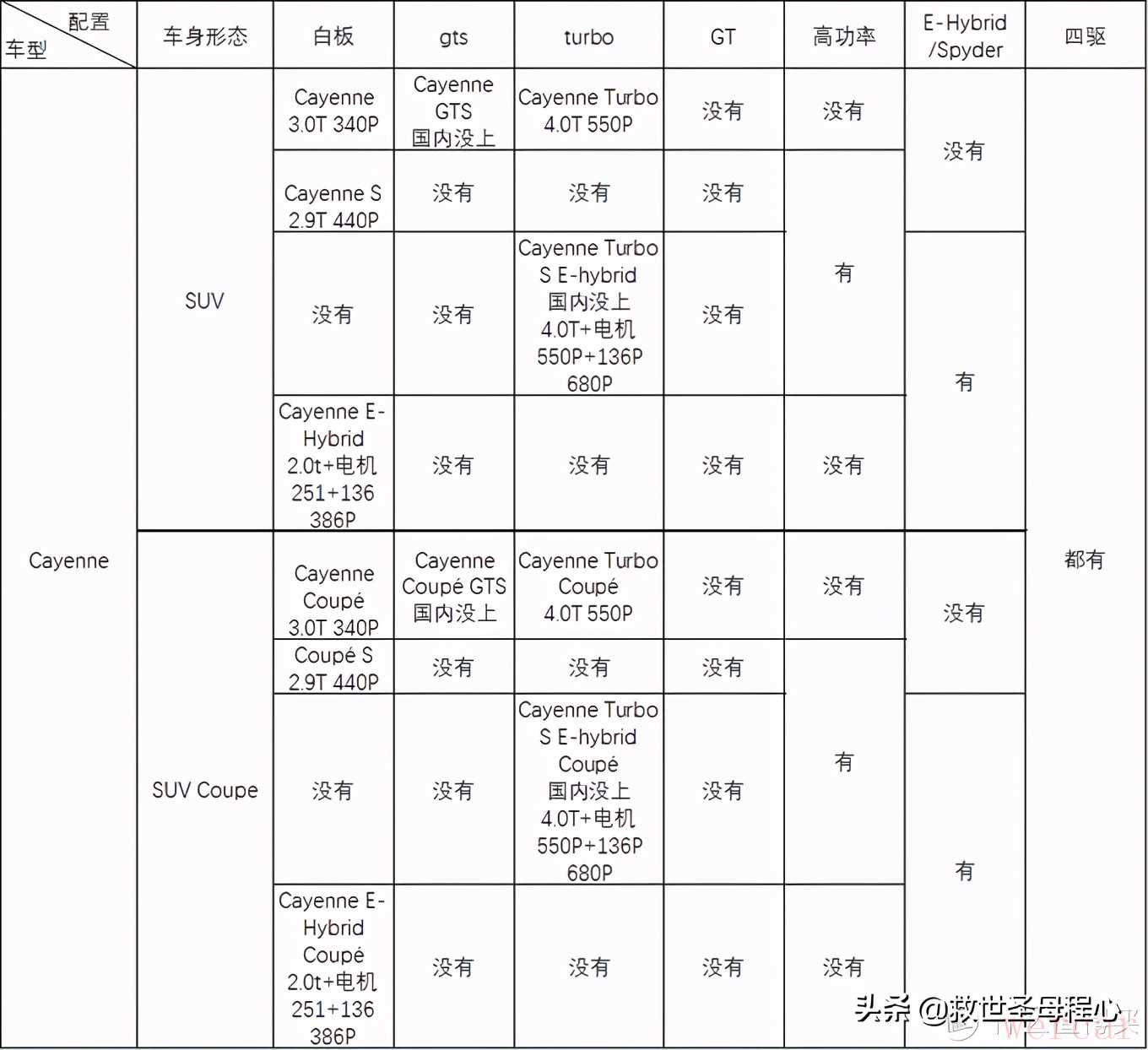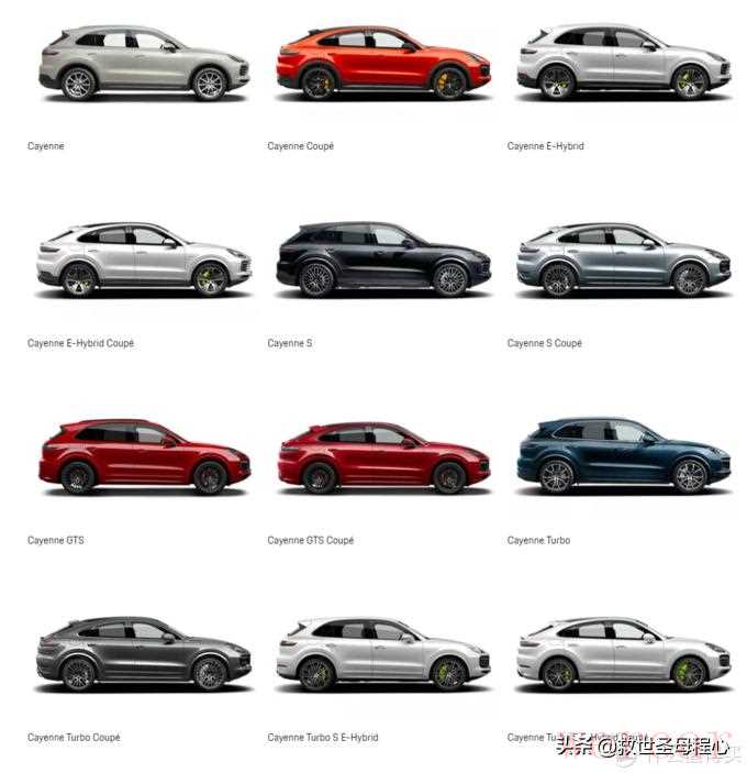 好的这下我们知道保时捷的套路了,让我们增大一点难度,来看看有两种车身形态的卡宴。这代卡宴提供了普通和coupe两种车身,全系标配四驱。2代卡宴还是PL72平台,同平台的只有途锐,而现在3代采用MLB Evo平台,兄弟也多了q7 q8,urus和添越