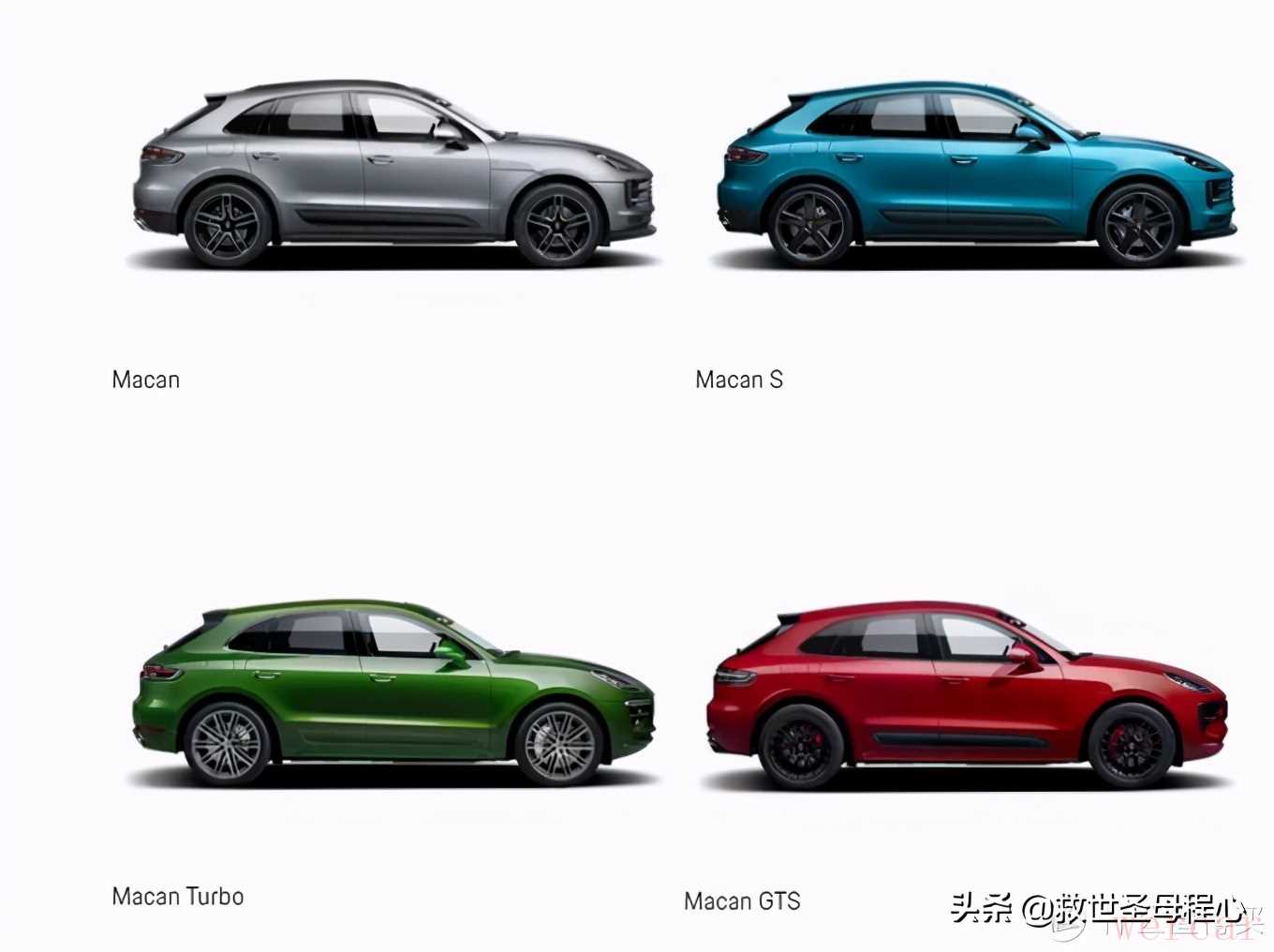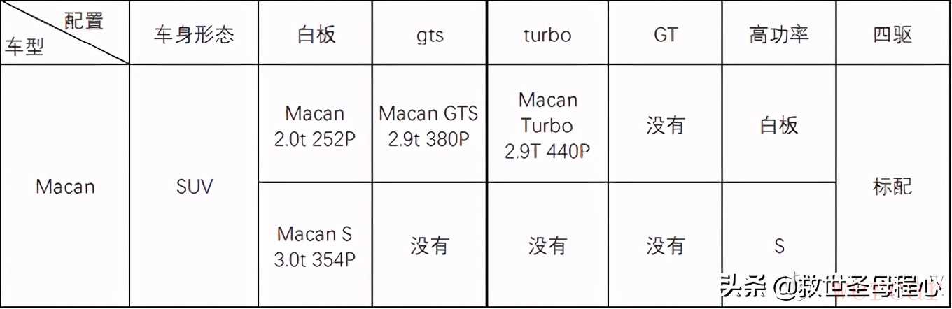 好了让我们实践一下这个命名是怎么排列组合的吧,首先我们从简单一点的,比较容易看懂且有代表性的suv说起吧,macan最初发布于2014年,近年来改款两次,但是并没有换代,提供白板,s,turbo,gts四种配置。