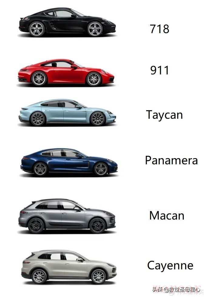 从车身形态上来说,718按硬顶和敞篷分为cayman和boxter两个车型,911则额外提供了targa版,而4门的帕梅提供标准,旅行版,加长版3种车身形态,卡宴提供了普通和coupe两种形态,其他车型则只有一种车身形态。