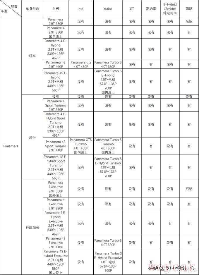 又来到花小钱装大13环节,帕梅提供三种车身形态,标准型加长型和旅行款,同时提供四驱款,四驱动力加强款,gts,turbo S这几个动力配置,并且有混动选项,排列组合一下车型数量惊人,从最白板的后驱330P到最顶配的四驱混动700P跨度巨大,顶配选配拉满都快能买法拉利了。
