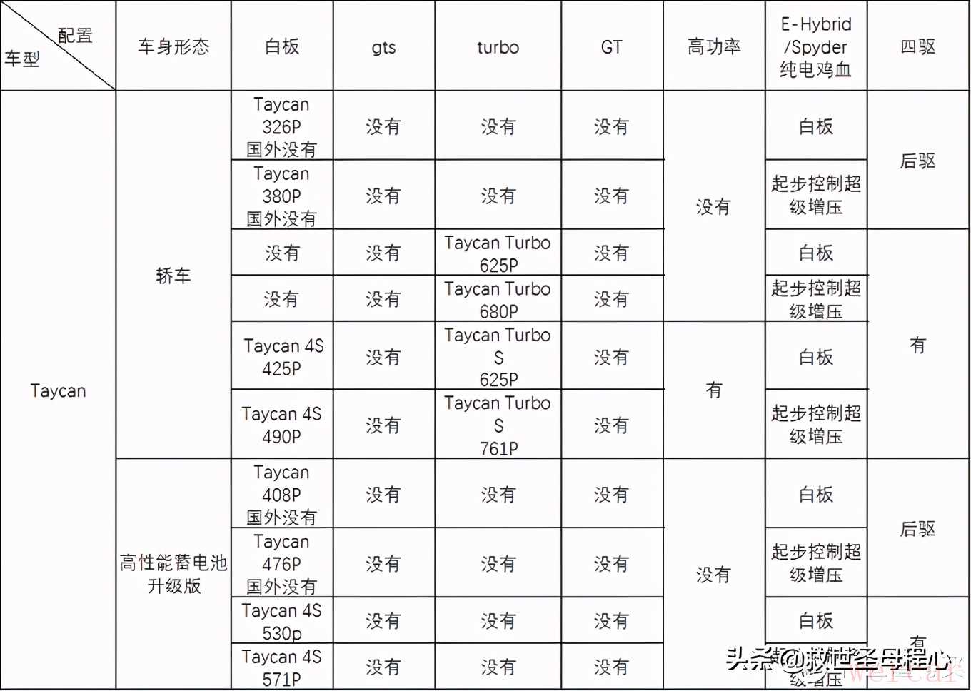 taycan目前国内提供4款车型,其中白板车型是后驱车型,其余为四驱车型,海外则只提供除白板之外的三个车型。值得注意的是,白板和4s,还提供普通版和高性能电池版,而所有车型又分普通版和搭载起步控制超级增压的版本,所以排列组合一下就是一个车型4个(2个)动力,看的人眼花缭乱,最入门的款式比最顶配的款式动力差了一倍多,真是花小钱装大13,太值了。