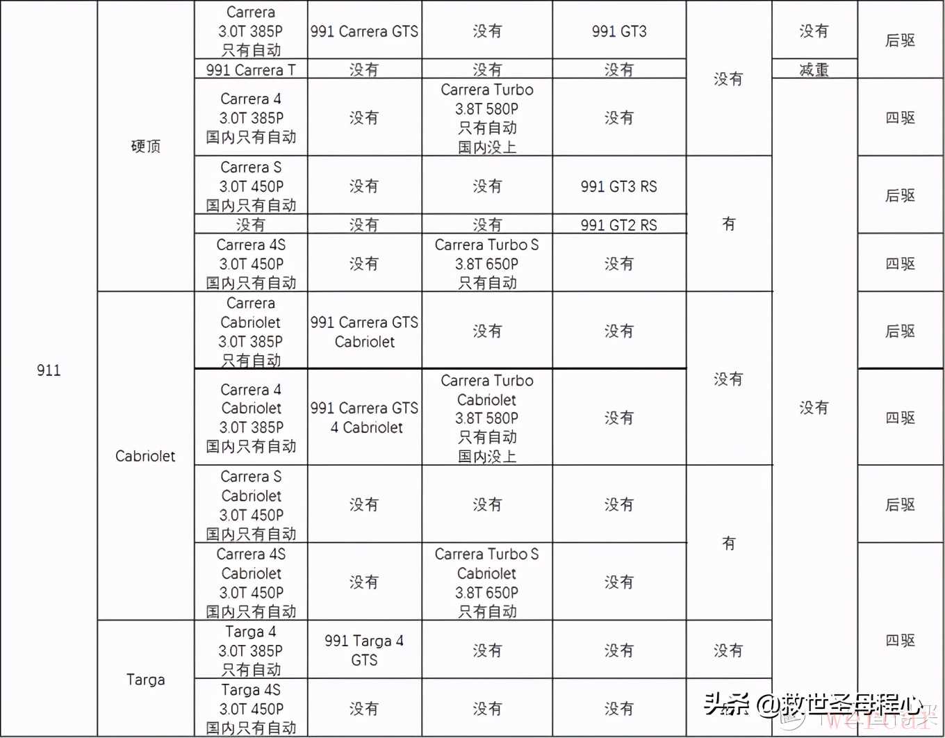 911也是目前保时捷唯一一个没有名字的车型,现款911(992)尚未推出gts和gt系列车型,所以我把一些991时代的车型也标上了。