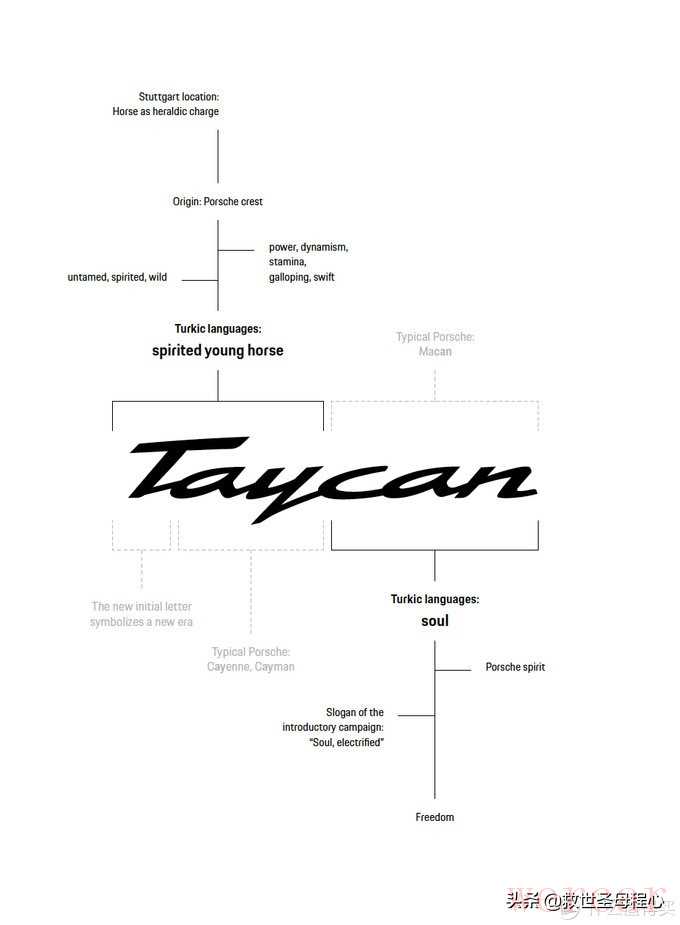 taycan这个名字来源于土耳其语,tay是活泼的幼马的意思,指保时捷徽章上斯图加特徽章里的马,can则是灵魂的意思,同时也和macan凑个热闹,另外taycan在日语读音大概可以理解为物理体验的意思