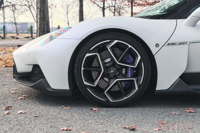 20英寸轮圈搭配蓝色刹车卡钳动感十足,前六后四的陶瓷碳纤维刹车系统保证其的性能表现。前轮胎规格为245/35 R20,后轮为305/30 R20,使用的是普利司通POTENZA SPORT系列。